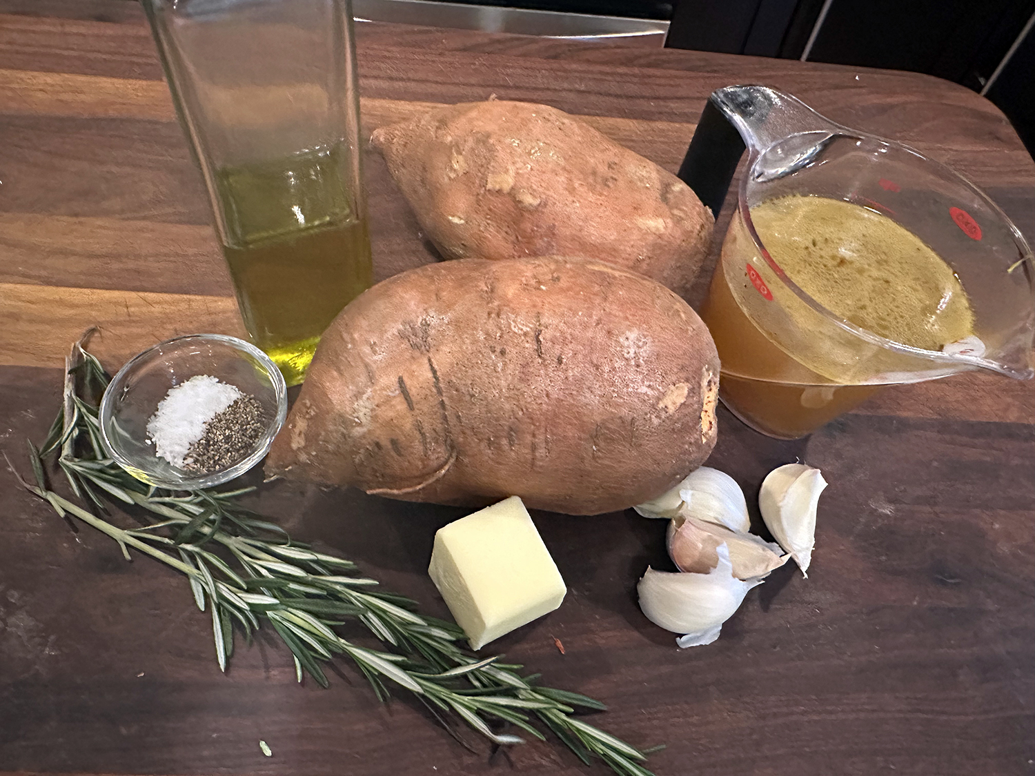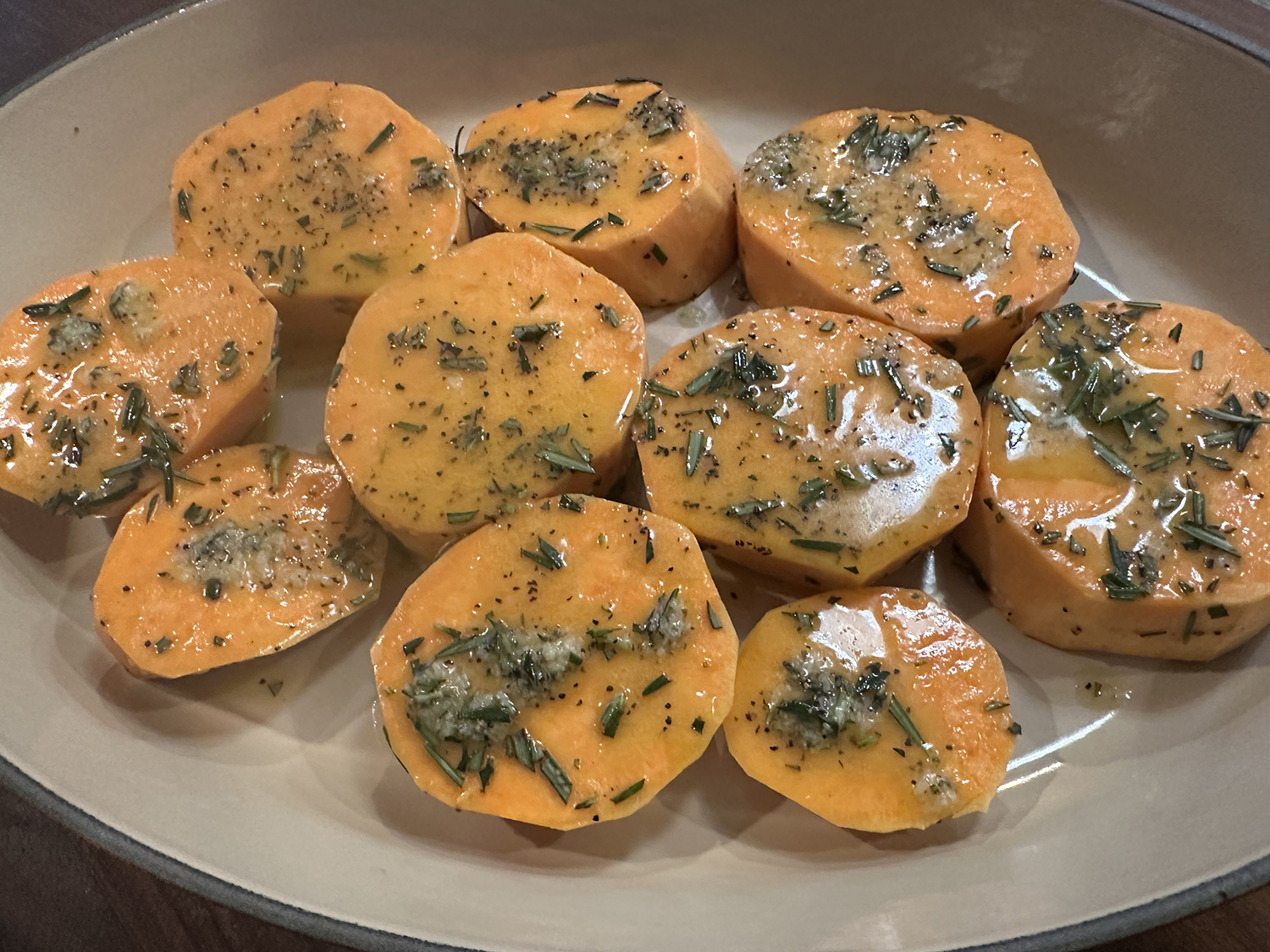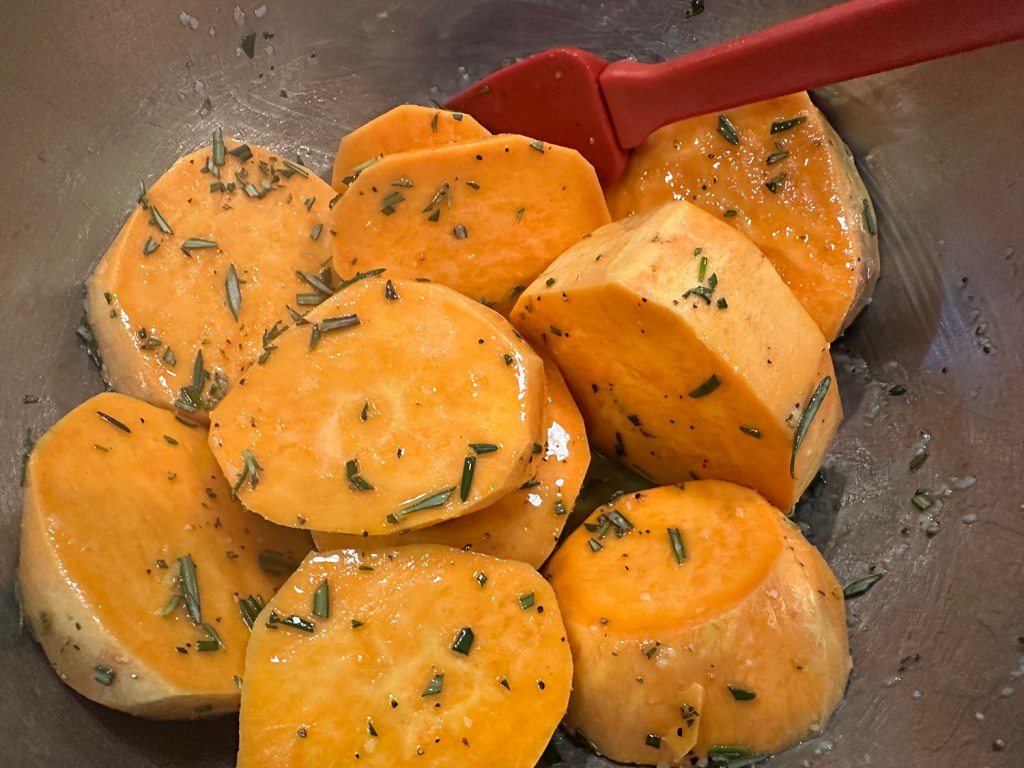Stir 2 tablespoons melted unsalted butter, 2 tablespoons olive oil, 3/4 teaspoon kosher salt, and 1/2 teaspoon black pepper together in a large bowl until combined. Add 2 pounds cut sweet potatoes (peeled if desired) and 1 tablespoon coarsely chopped fresh rosemary leaves, and toss well to coat.