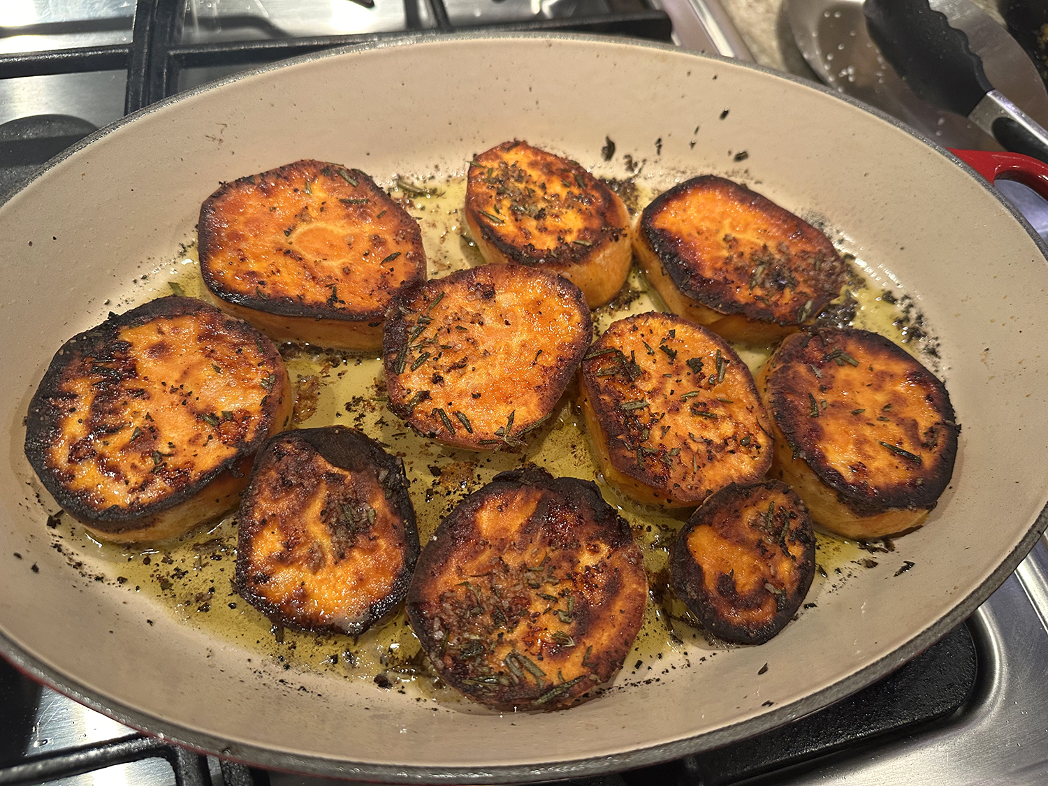 Roast until the sweet potatoes easily release from the pan with tongs and the bottoms are light golden-brown, about 15 minutes. Flip the rounds and roast until the bottoms and tops are deep golden-brown, about 15 minutes more.