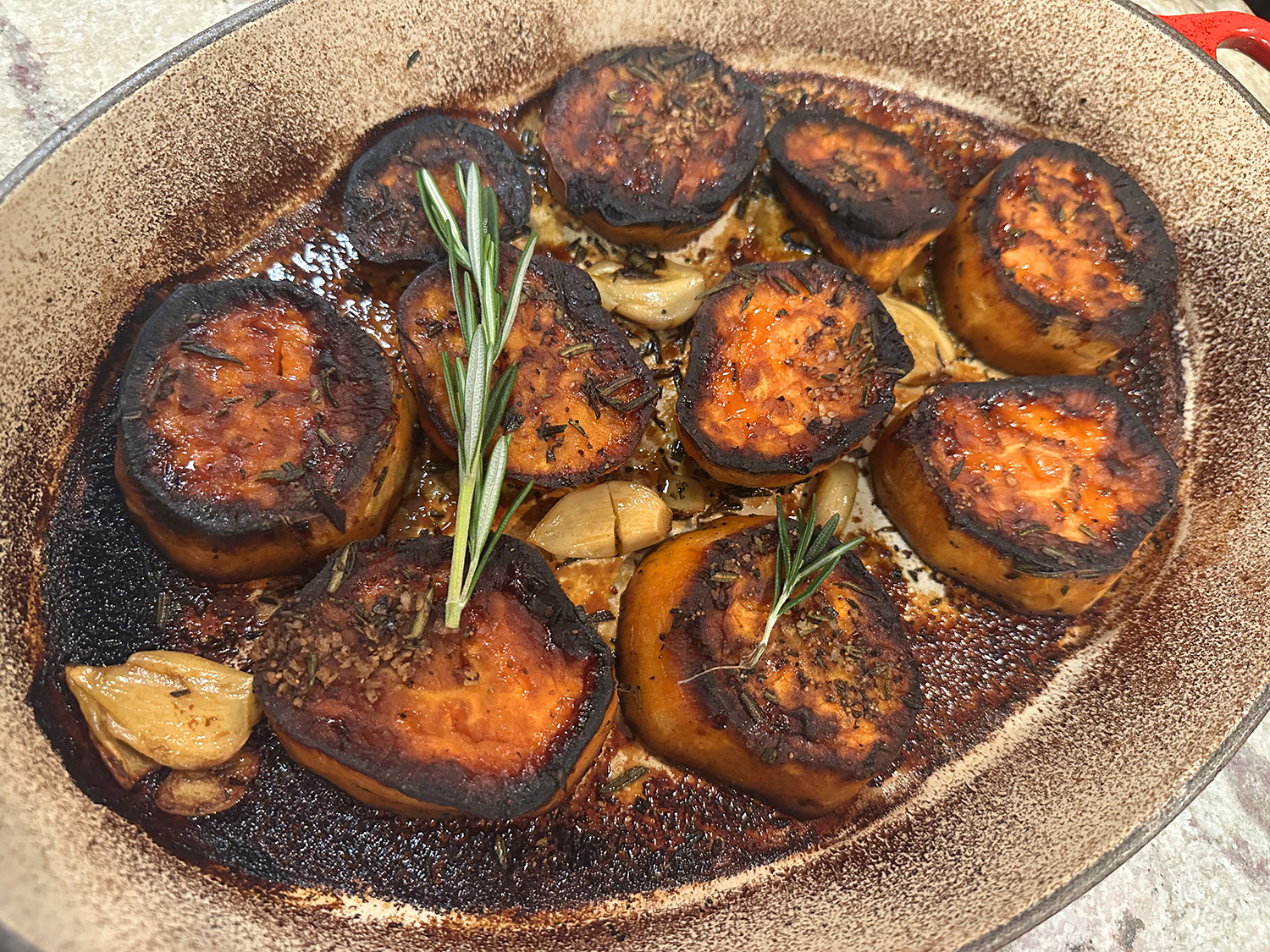 All you have to do is flip the potatoes once at the 15 minute mark. Flip again in another 15 minutes and add the broth, then back into the hot oven for the last 15 minutes. You have sweet potatoes that are browned and crispy on the edges with the most decadently creamy center (they actually do melt in your mouth).
