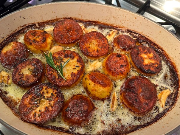 Transfer the potatoes cut-side up to a 9×13-inch metal baking pan (avoid glass, as it could shatter) or rimmed baking sheet (quarter sheet pan) and arrange in a single layer. Drizzle any remaining butter mixture over the potatoes.