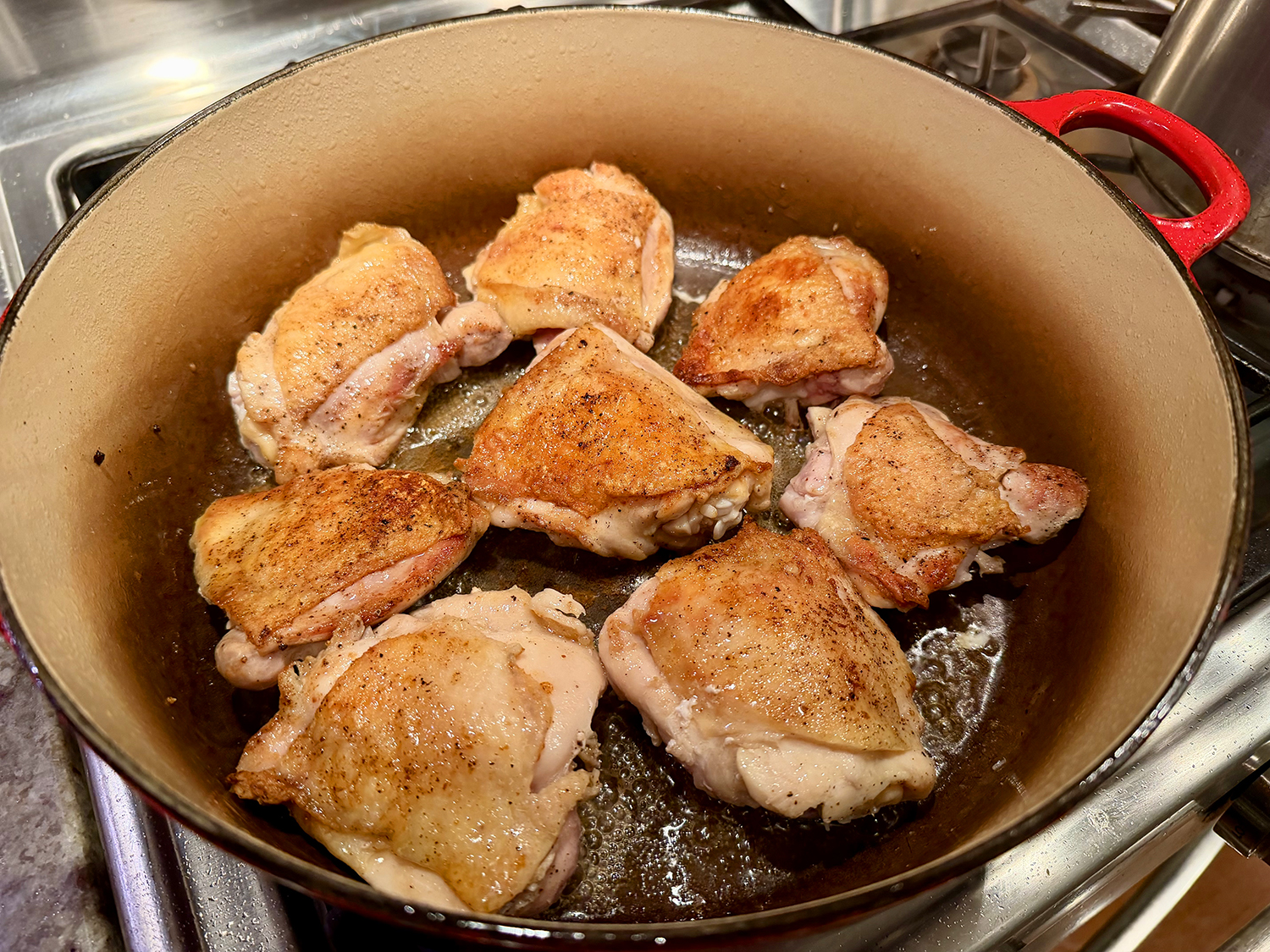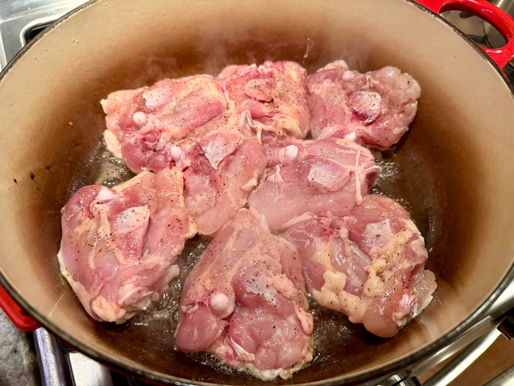 - In a large Dutch oven or heavy oven-safe pot, heat 3 tablespoons olive oil over medium-high heat until shimmering but not smoking. Season half the lamb with salt and brown the seasoned lamb on all sides, about 10 minutes total. Remove the lamb to a bowl or quarter sheet pan. Salt and pepper the remaining lamb, and brown on all sides, another 10 minutes total. Remove to bowl or sheet pan when done.
