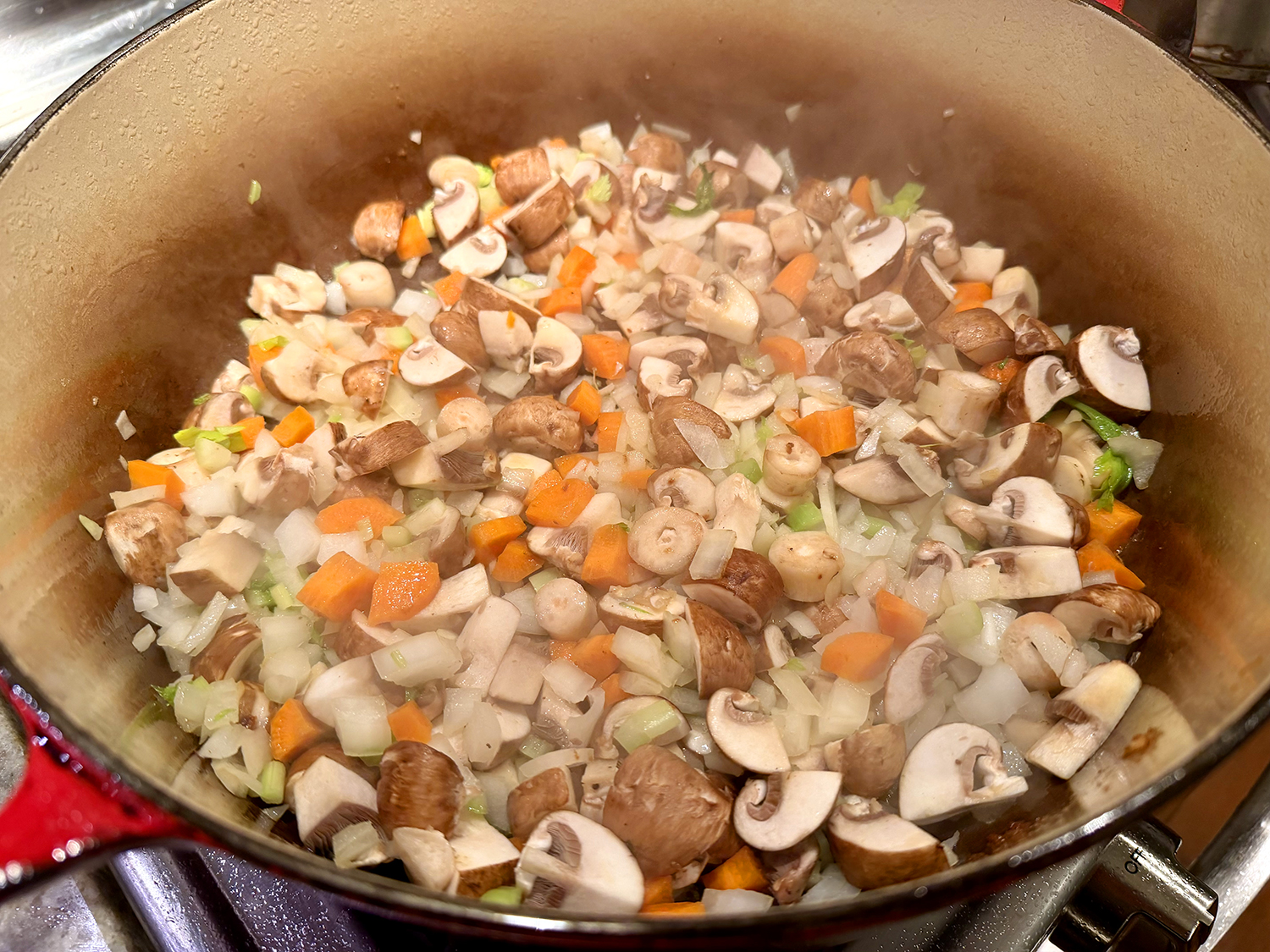 - Reduce heat to medium and add more oil if needed. In the heated oil, sauté the onions, carrots, and potatoes for 5 minutes. Add the garlic, season the vegetables with salt and pepper, and sauté for an additional 2 minutes.