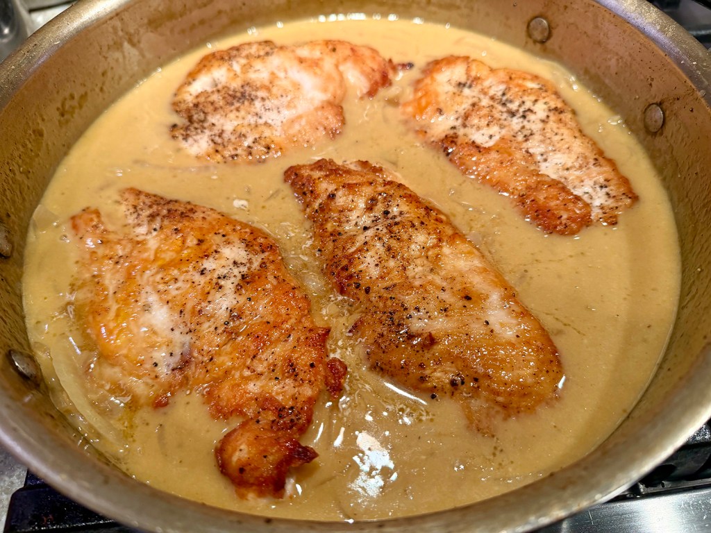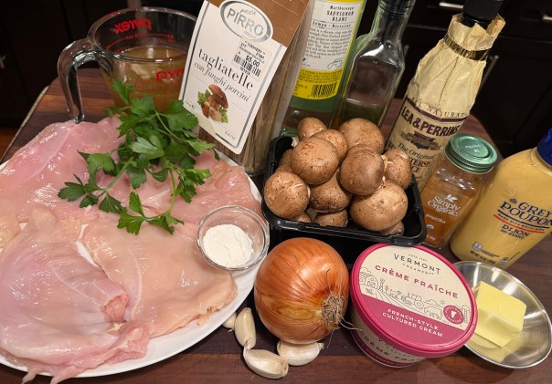 For a comforting meal in under an hour, thin-cut chicken breasts cook quickly and brown beautifully, while a splash of white wine, Dijon mustard, and crème fraîche make a silky, deeply savory sauce. We served over mushroom tagliatelle but other options are egg noodles, rice, or mashed potatoes.