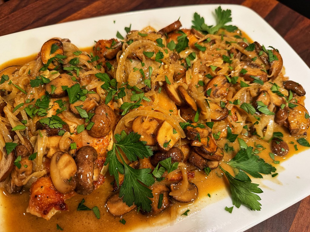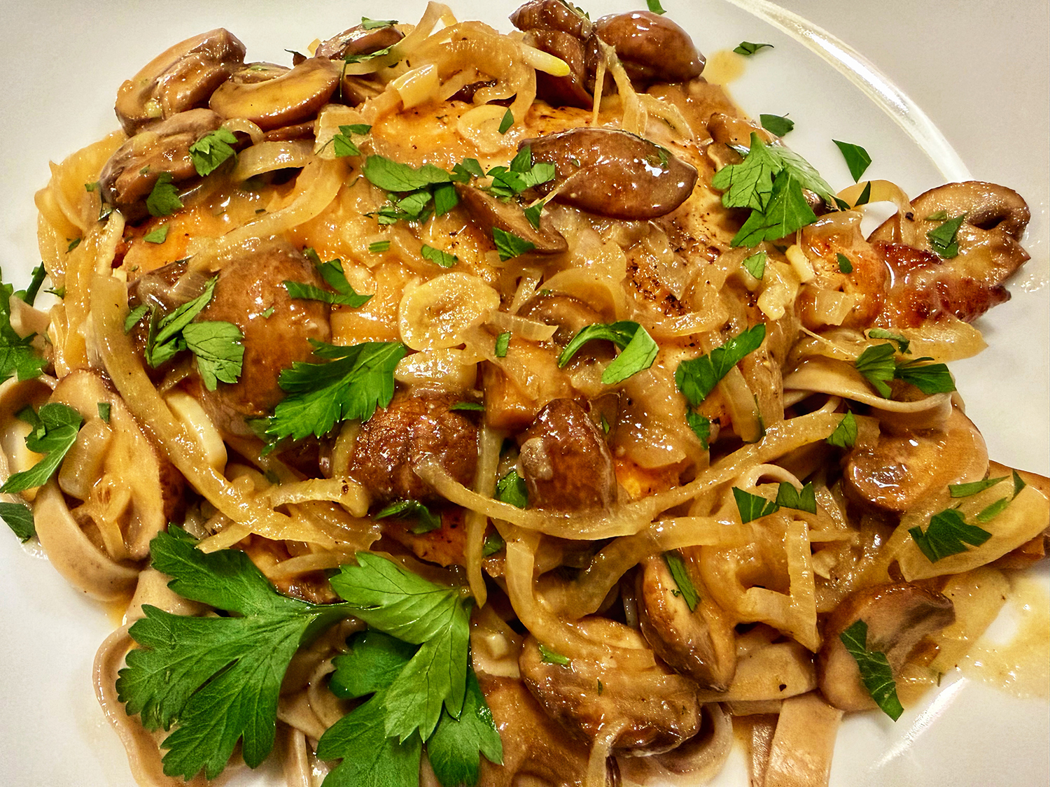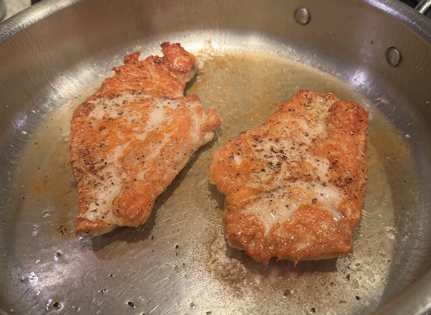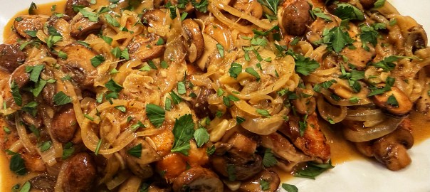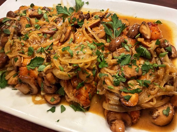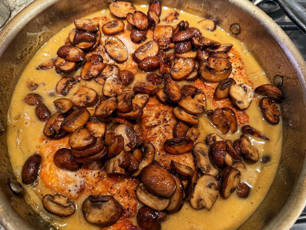 NOTES: If you want to save yourself a few bucks, buy ordinary boneless chicken breasts and pound them down to a thinner thickness. The directions indicate to cook the mushrooms in a single layer, undisturbed. There were too many shrooms for a single layer, so you may have to stir them an occasionally until they shrink and almost fit into one layer and turn deep golden brown.