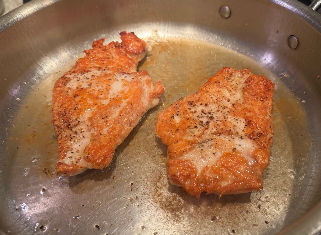 - Lightly season 4 small thin-sliced skinless, boneless chicken breasts (about 1½ lb. total) all over with kosher salt and freshly ground pepper. Heat 3 tablespoons extra-virgin olive oil in a large skillet over medium-high. Working in 2 batches and adding more oil between batches, cook chicken in a single layer, undisturbed, until golden brown underneath, about 5 minutes. Turn and cook on other side until nearly cooked through, 2–3 minutes. Transfer to a plate. (The pan may have browned bits stuck to it, but that flavorful fond will be deglazed shortly.)