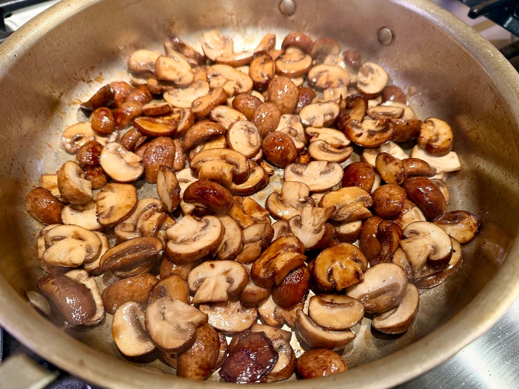 - Increase heat to high; add 2 tablespoons extra-virgin olive oil to pan. Arrange 1 pound cremini mushrooms, sliced ¼” thick, in pan in a single layer as much as possible and cook, undisturbed, until golden underneath, about 4-5 minutes. Stir; season lightly with salt (this will help draw out water from the mushrooms) and cook, undisturbed, until golden, about 5 minutes. Continue to cook, stirring occasionally, until liquid released from mushrooms is mostly evaporated and mushrooms are deep golden brown, 2–3 minutes more. Transfer to a large plate, spreading out to keep from steaming.