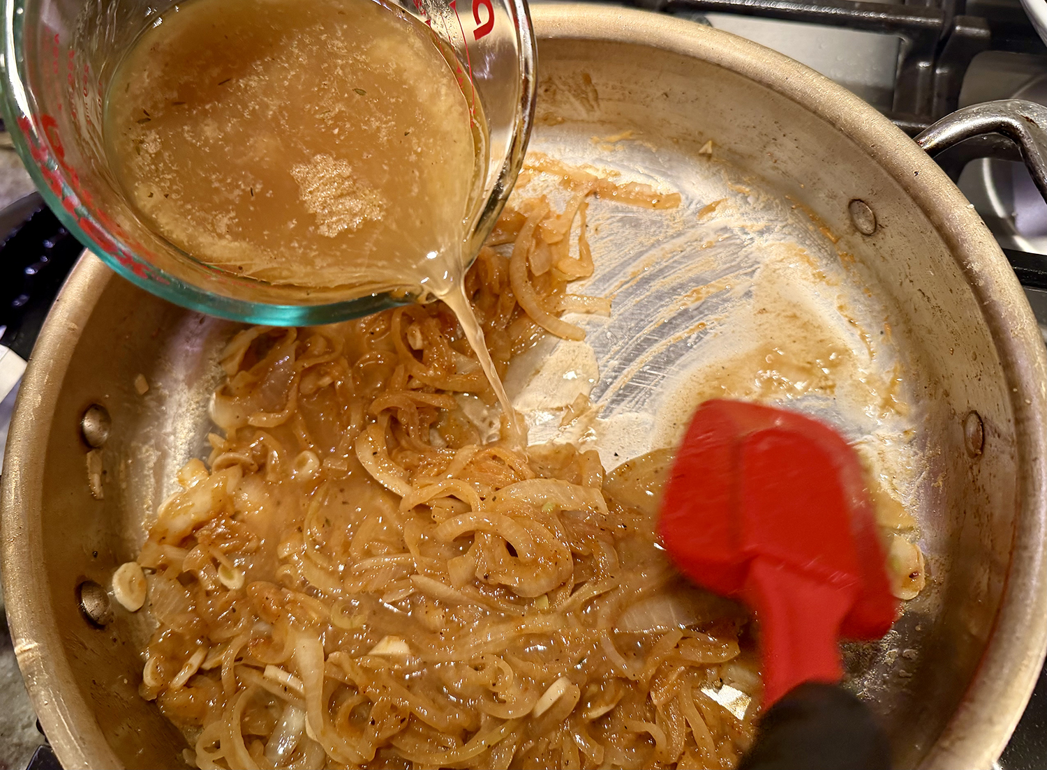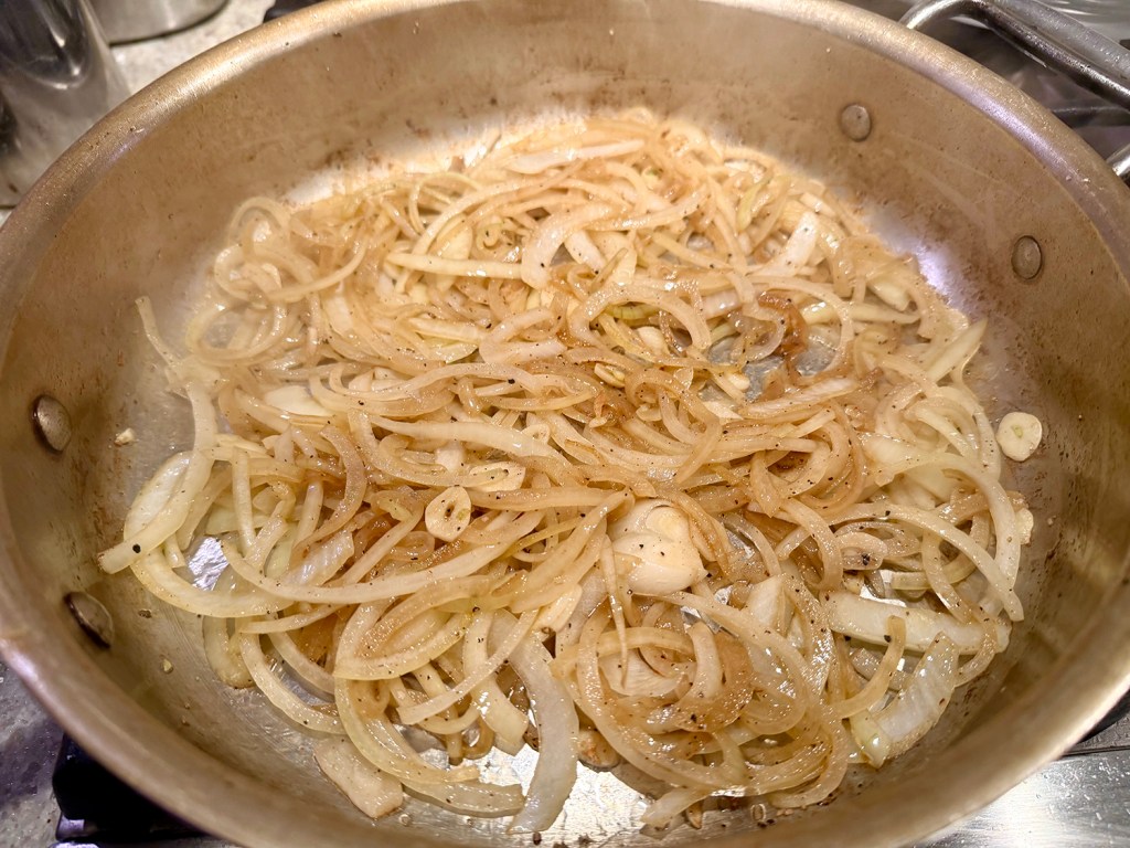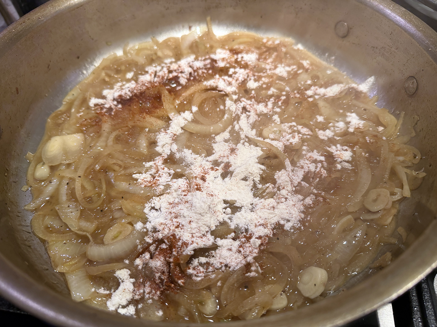 - Reduce heat to medium and heat remaining 2 tablespoons extra-virgin olive oil in pan. Add 1 medium onion, thinly sliced, and 4 garlic cloves, thinly sliced, season with salt and pepper, and cook, stirring occasionally, until slightly softened, 3–4 minutes. Add ½ cup dry white wine; simmer, stirring occasionally and scraping up any browned bits, until almost completely evaporated, 1–2 minutes. Add 1 tablespoon all-purpose flour and ½ teaspoon paprika; cook, stirring constantly, until a thin film starts to form on bottom of pan, 30–60 seconds. Gradually pour in 1½ cups low-sodium chicken broth, stirring constantly. Increase heat to medium-high; bring to a rapid simmer and cook until sauce is thick enough to lightly coat a spoon, about 3 minutes.