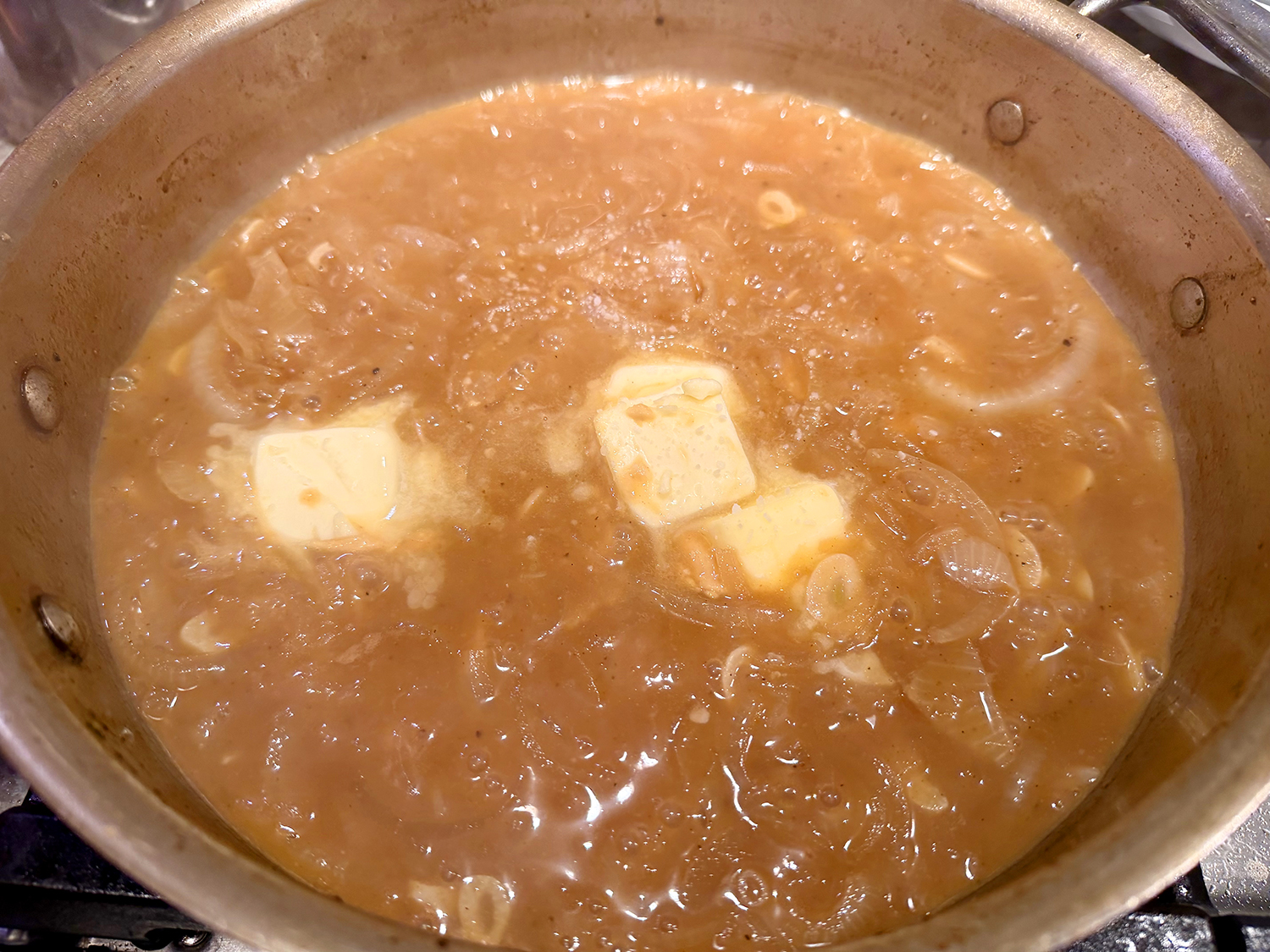 - Reduce heat to low; add ⅓ cup crème fraîche, 3 tablespoons unsalted butter, cut into pieces, 1 teaspoon Dijon mustard, 2 dashes Worcestershire sauce, and ½ teaspoon Diamond Crystal or ¼ teaspoon Morton kosher salt. Cook, stirring often, until butter is melted and emulsified, about 2 minutes. Taste sauce; season with more salt if needed. Return chicken and mushrooms to pan and cook, basting with sauce with a large spoon, until warmed through, about 1 minute. Remove from heat; top stroganoff with chopped parsley. Serve over cooked egg noodles, mashed potatoes, steamed rice, or country-style bread.
