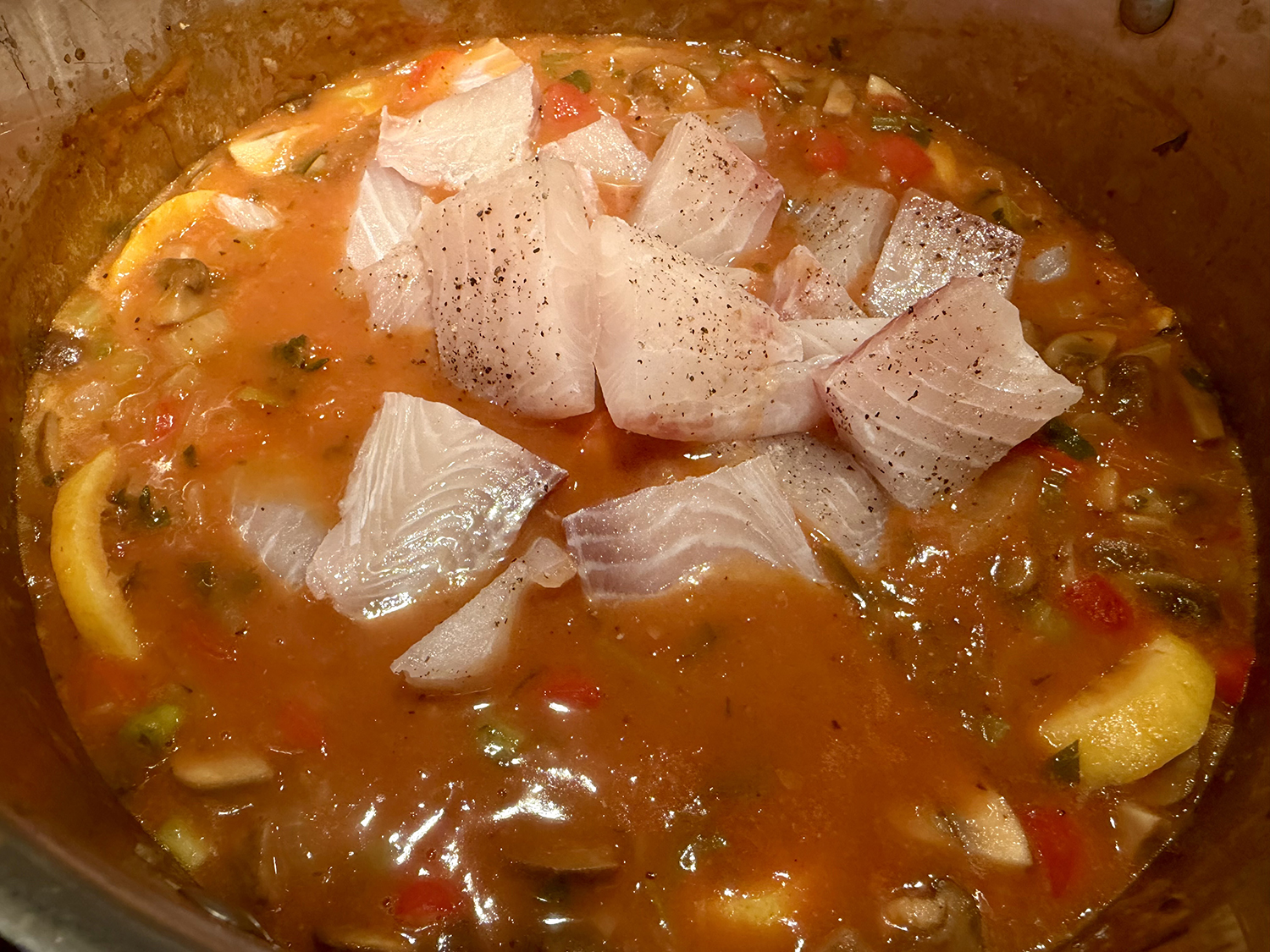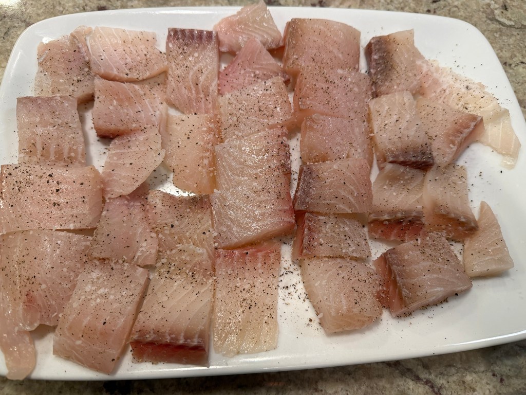 - Cut the fish into 2-inch pieces. Season all over with salt and pepper. Cover and set in the refrigerator while preparing the stew.