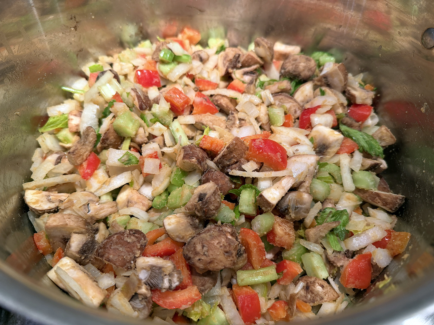 - Add the onion, celery, bell pepper and mushrooms, plus a large pinch of salt. Increase the heat to medium and cook until softened, stirring occasionally and scraping the bottom of the pot as necessary, about 8 minutes. Stir in the garlic and cook until fragrant, 1 to 2 minutes. Stir in 1 teaspoon salt and ½ teaspoon pepper.