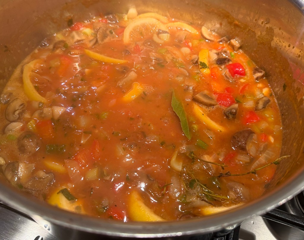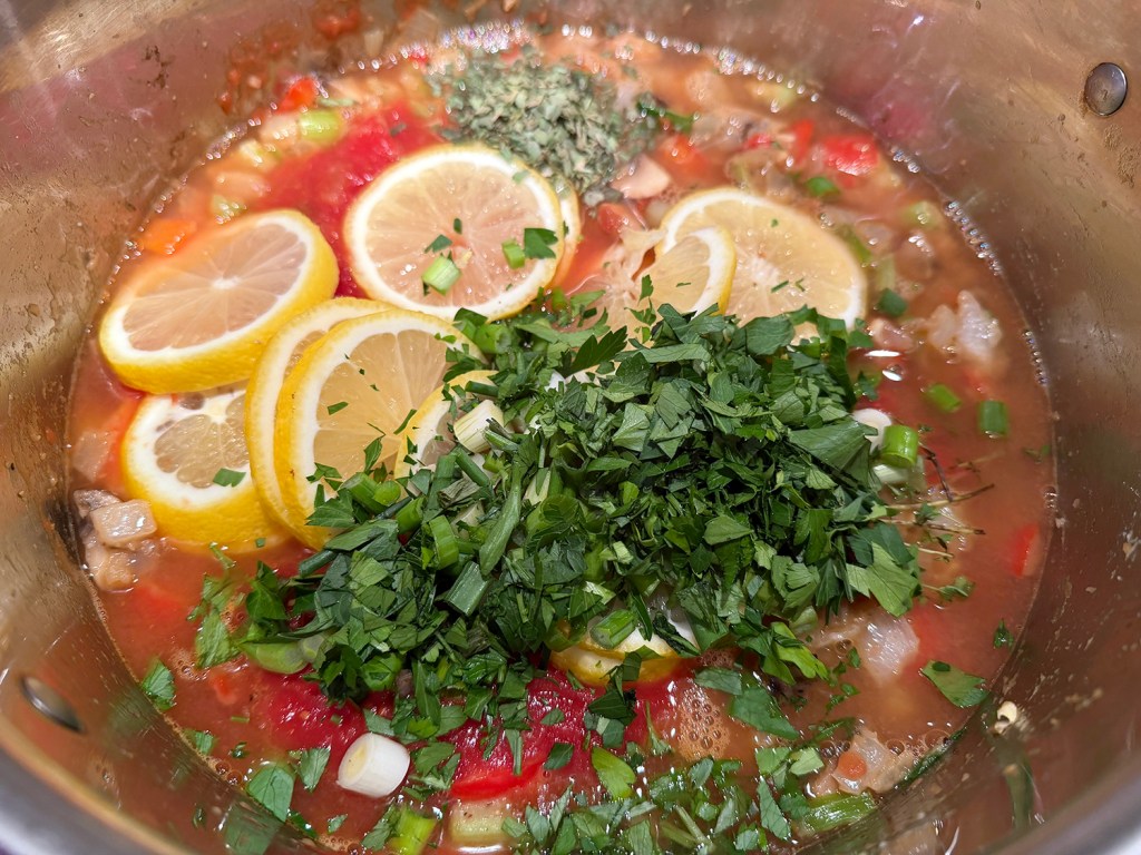 - Stir in crushed tomatoes, stock, bay leaves, thyme sprigs, lemon slices, parsley, scallions and basil, scraping the bottom of the pot. Increase the heat to bring the stock to a hearty simmer. Once simmering, reduce the heat to low and cover with the lid. Let simmer for 15 minutes, stirring once or twice.