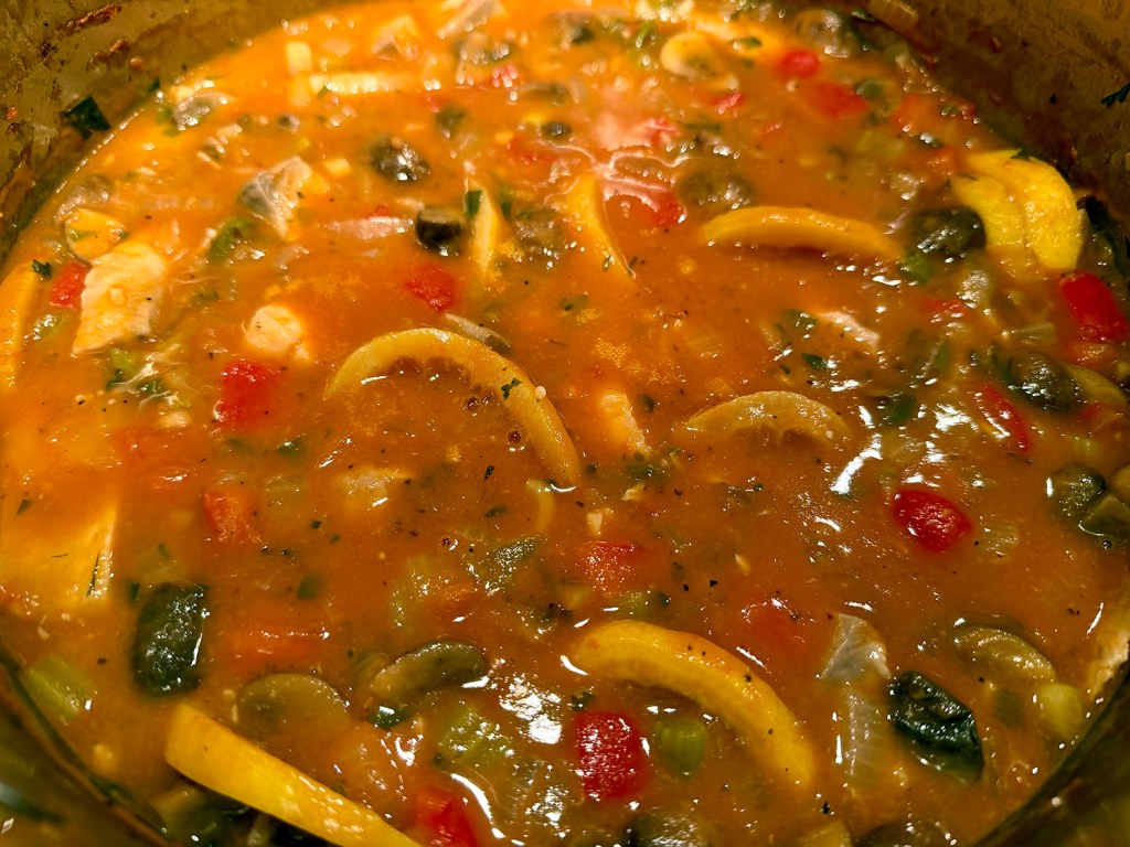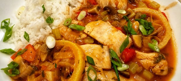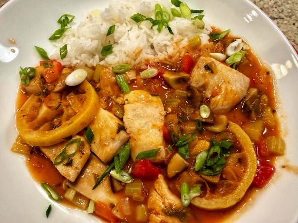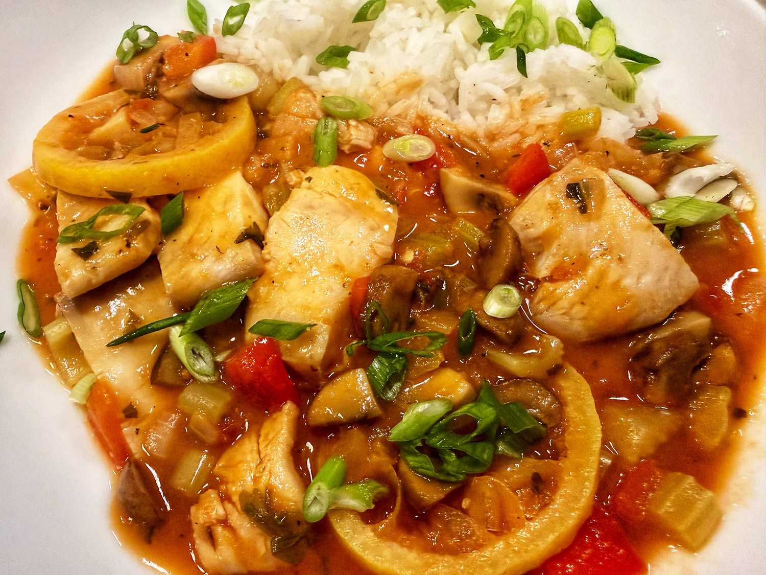 Here, mild tilapia (our choice) or cod are poached in the tomato broth, contributing flavor and savoriness. The slices of lemon that are stewed alongside add citrusy bursts that enhance the fish and broth, and are a hallmark of this dish. The original recipe calls for 2 large lemons. This may be a bit too tart for some, so use only one large lemon, or two small if that’s the case.
