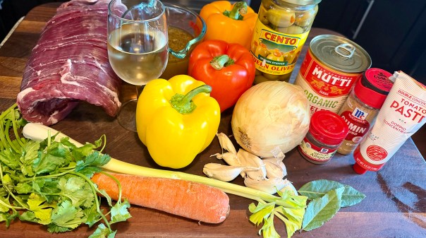 Once the beef is browned and removed from the pot, sliced onions and bell peppers, are added plus a generous dose of minced garlic, and all are cooked down until softened. Next, spices like cumin and dried oregano, and a small amount of tomato paste are added, cooking it all for a minute or two to deepen the flavors of those ingredients. Then in go white wine, canned tomatoes, and water or chicken stock. (If you have homemade beef stock, you can use it here; otherwise, chicken stock is the better option, as its flavor is always superior to that of store-bought beef broth.)