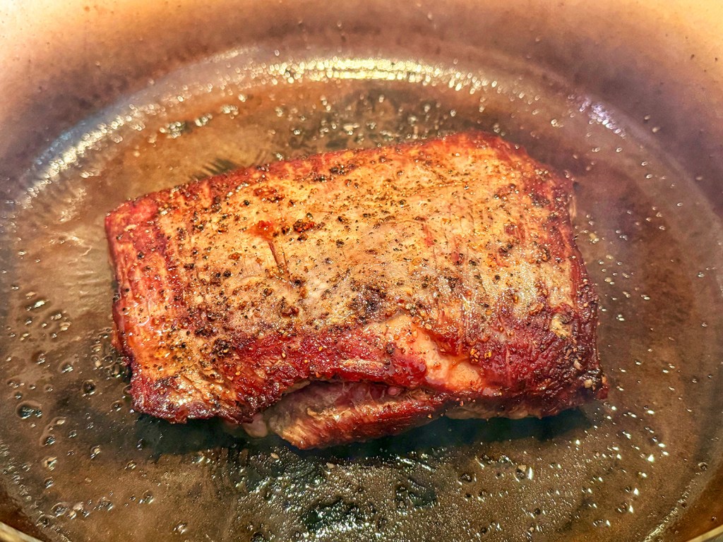 The whole pot can is left on the stovetop to simmer, or goes into a 350°F oven to cook until the beef is tender. The oven adds an extra layer of complexity, since the enveloping heat allows the stew’s surface to brown as it cooks, something that doesn’t happen on a burner.
