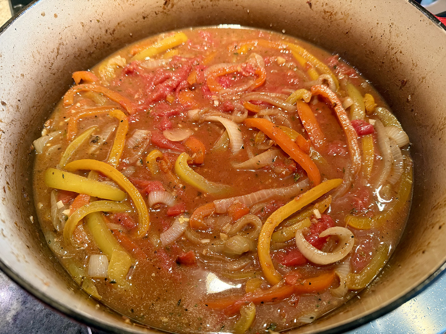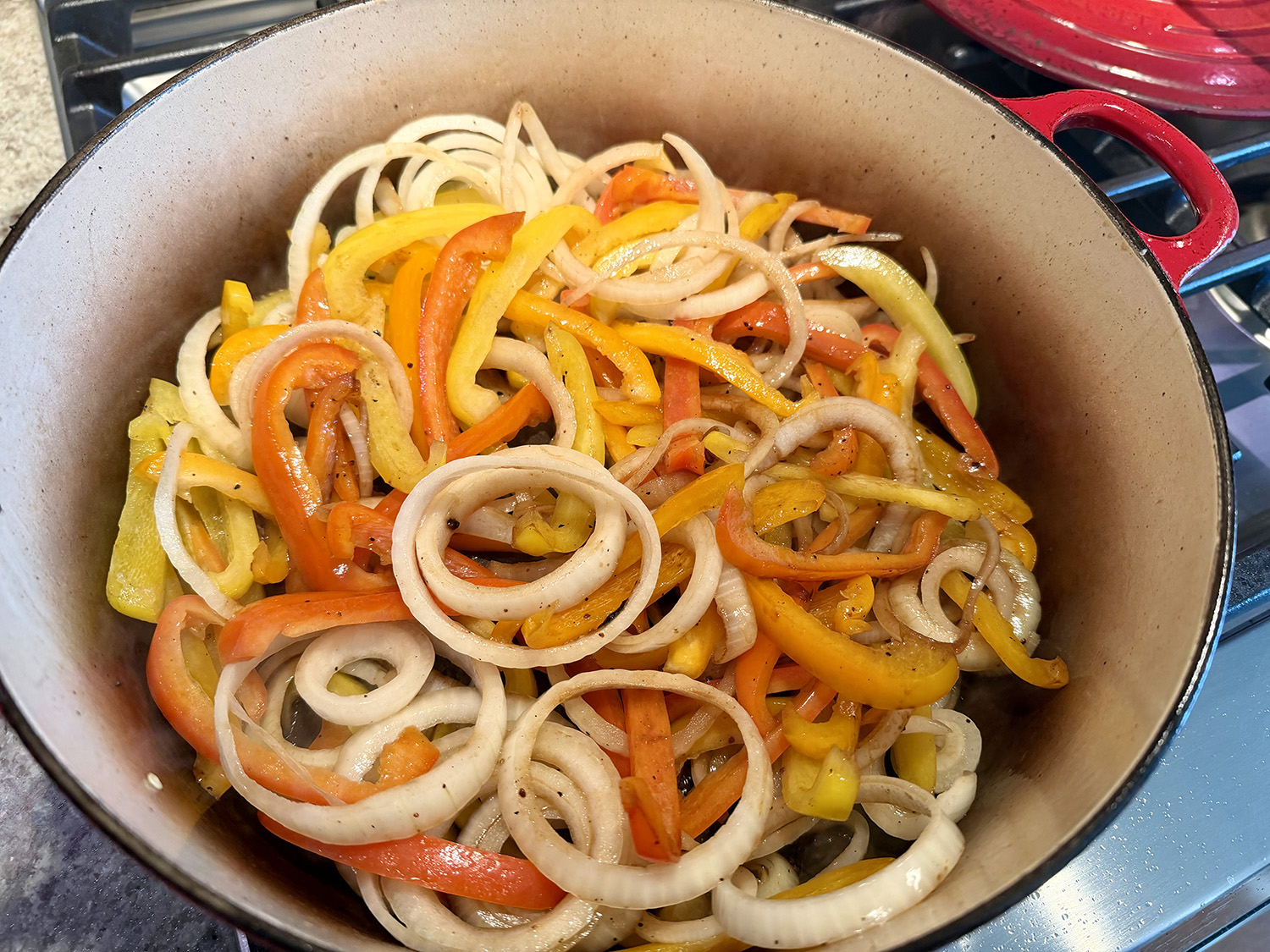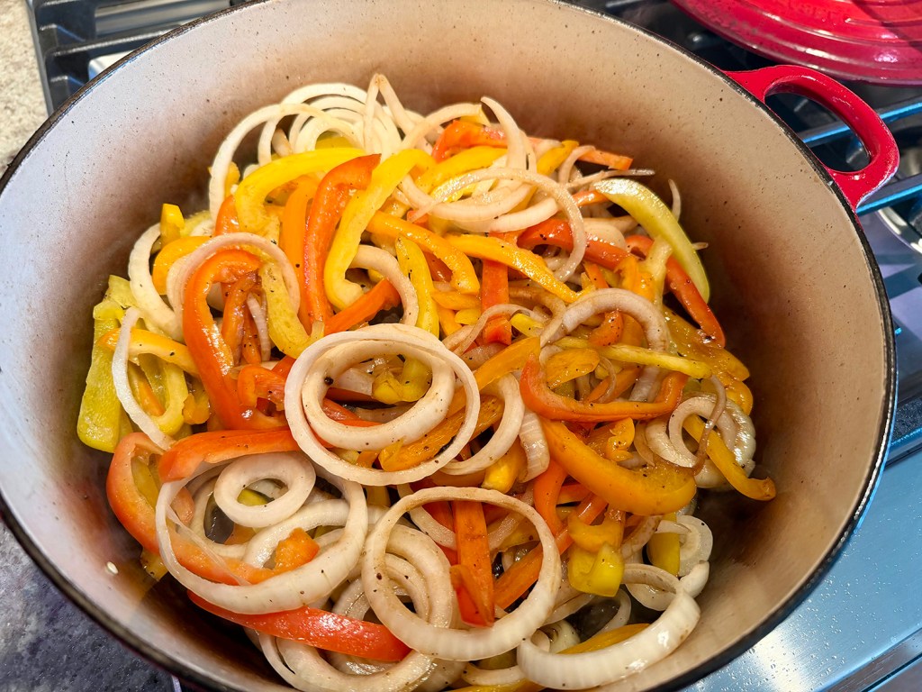 - Add onion and bell peppers to Dutch oven and cook, stirring and scraping up browned bits from bottom of pot, until onion and peppers are tender, about 8 minutes. Add garlic and cook for 1 minute longer; lower heat and/or add more oil at any point if ingredients threaten to burn.