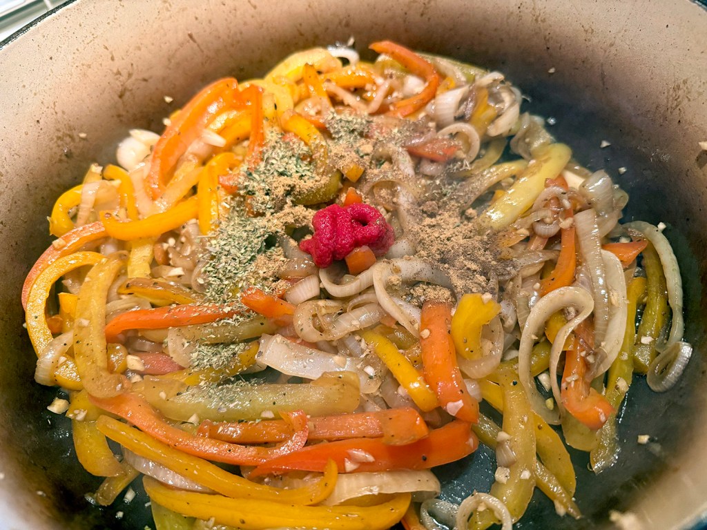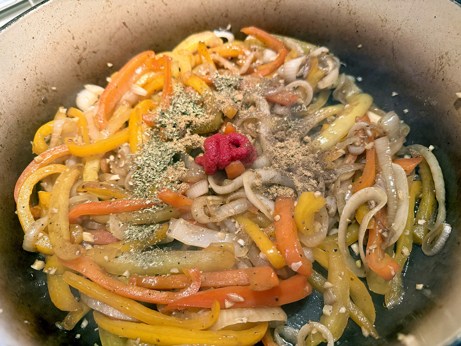 - 3 red, yellow, and/or orange bell peppers, stemmed, seeded, and thinly sliced