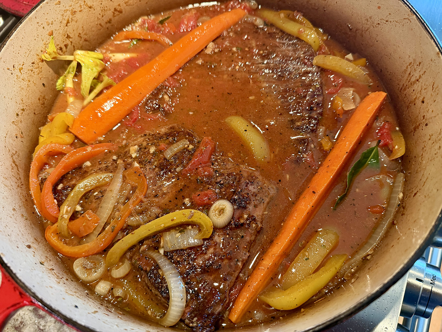 - Add white wine and bring to a simmer, scraping up any browned bits from bottom of pot. Boil until raw alcohol smell has cooked off from wine, about 2 minutes, then add canned tomatoes and stock. Return beef to pot, nestling it under the liquid among onions and peppers, along with any of its accumulated juices. Nestle bay leaves, carrot, and celery into pot. Add more stock, just enough to cover all the ingredients, if necessary.