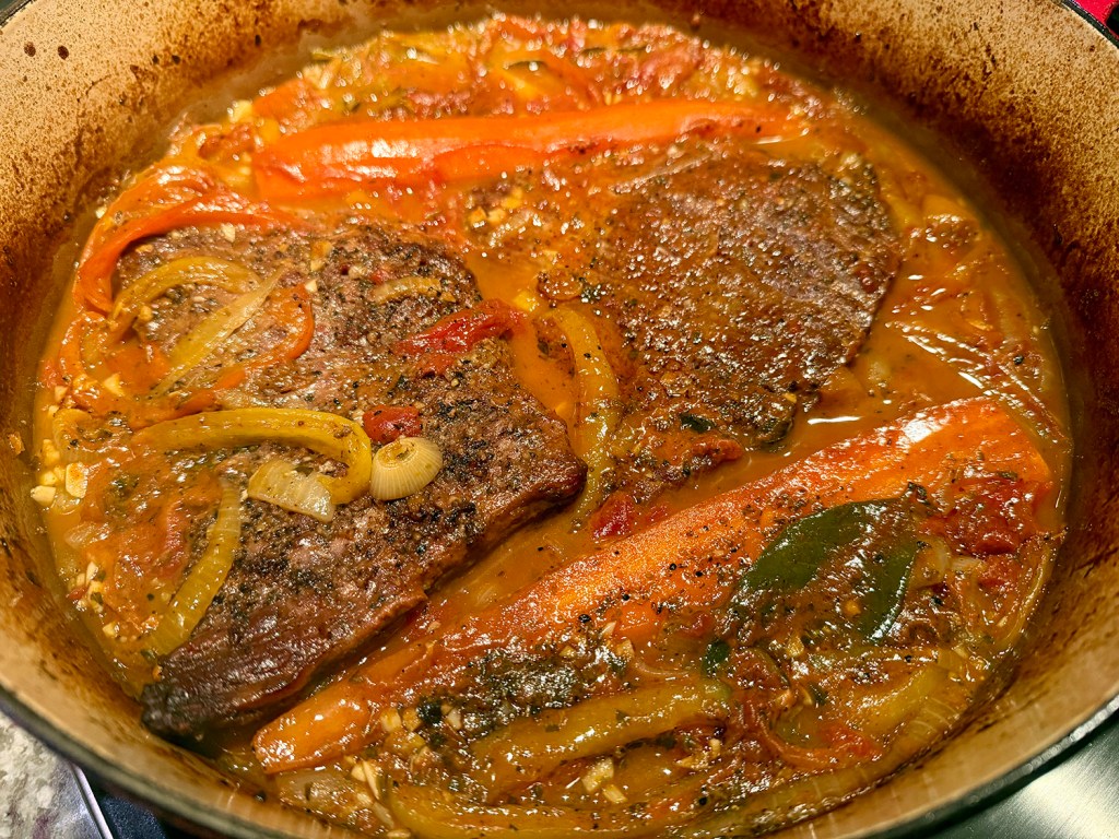 - Preheat oven to 350°F (180°C). Cut flank steak into large pieces that will fit on the bottom of a Dutch oven in 2 batches. Season with salt and pepper. Heat oil in Dutch oven over medium-high heat until shimmering. Working in batches, add steak and cook, turning, until browned, about 6 minutes per batch. Transfer steak to a plate and set aside.