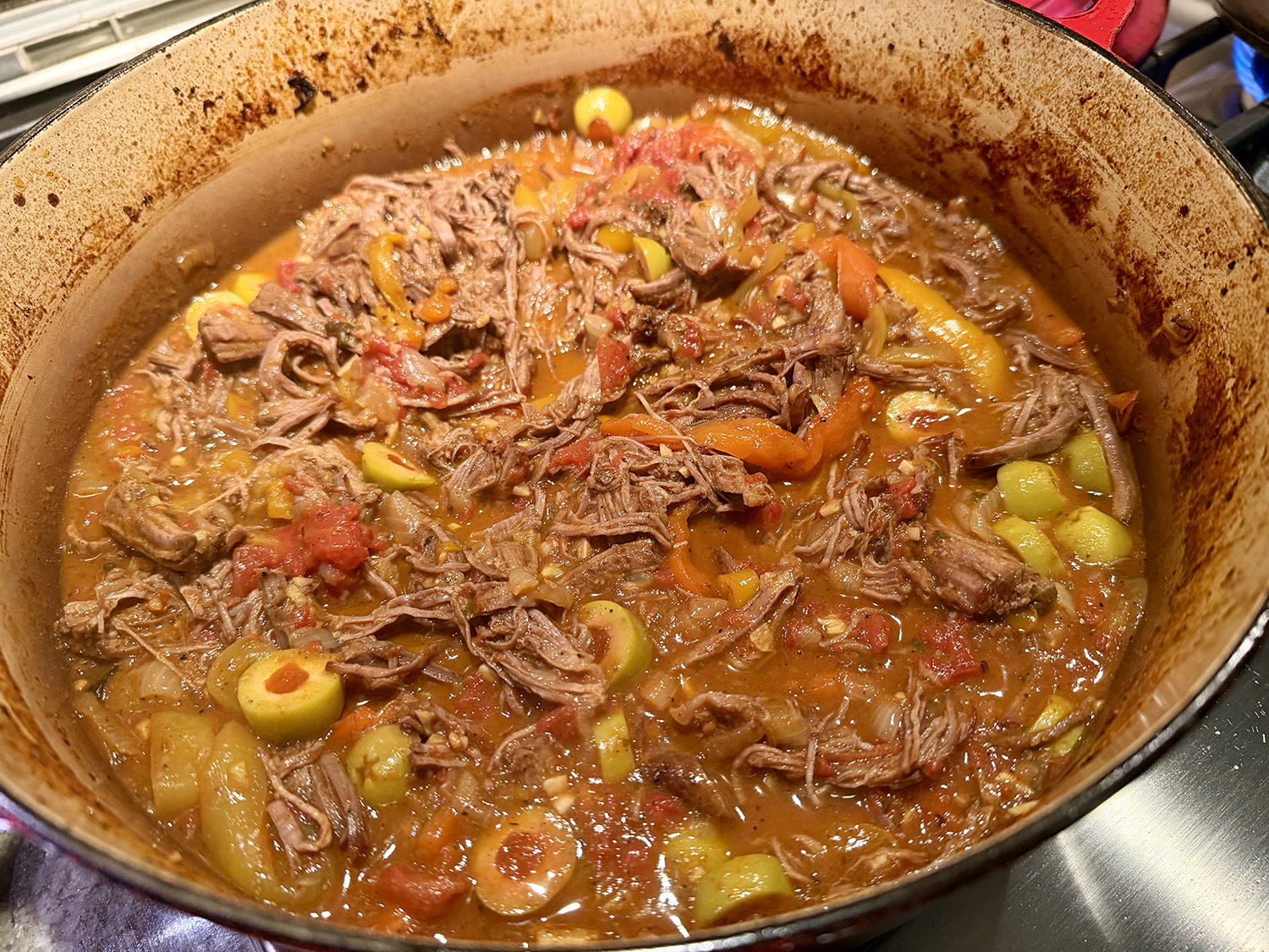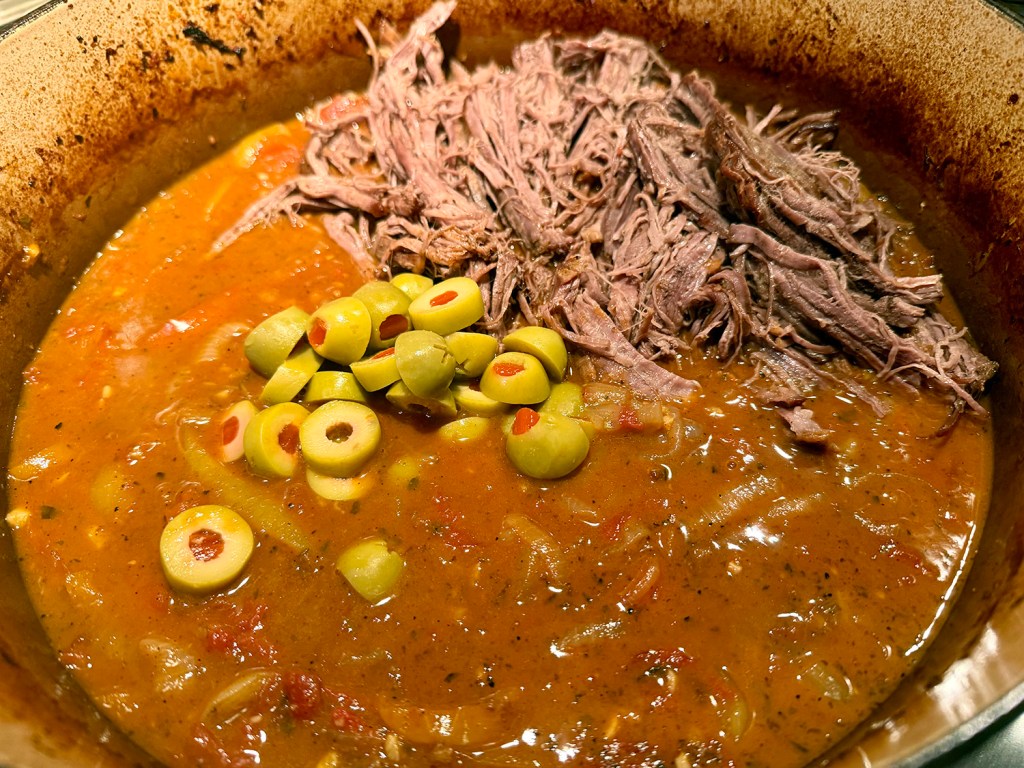 The final step is to fish out the bay leaves, carrot, and celery, then shred the meat into long, thin strands. Mix it back in, toss in some green olives, and simmer it just a little more until the juices have reduced enough to coat the beef in a rich sauce. (We chopped up the celery and carrot and tossed them back into the pot.)