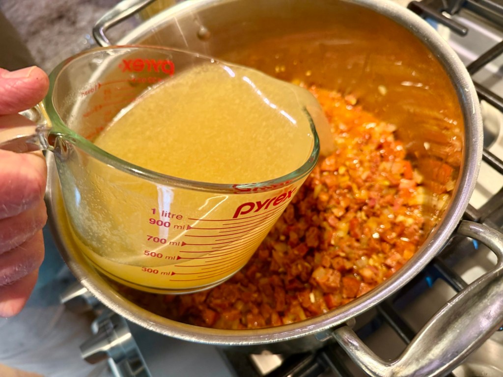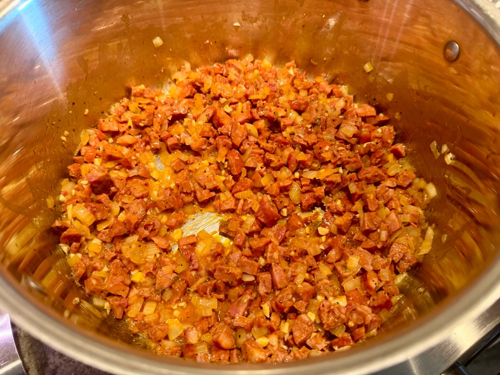 Our chorizo was precooked, so once we removed the casings, we chopped up the links and then browned them in the pot — no need to further break up the meat.