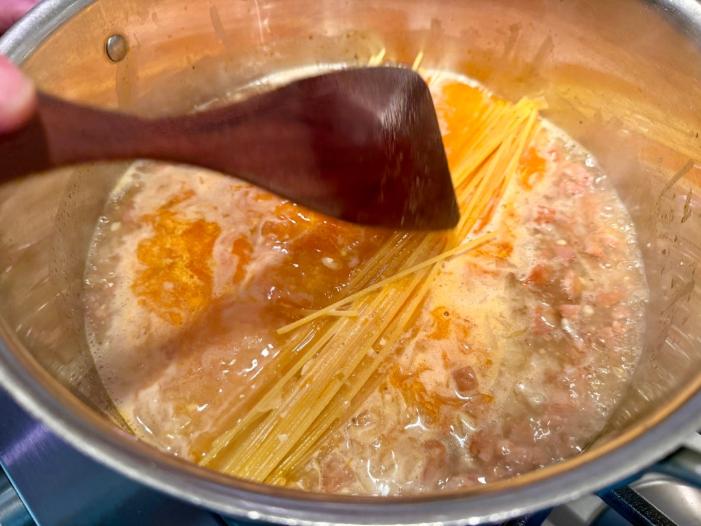 An almost full tube of double-concentrated tomato paste blooms directly in the sausage fat, turning deep brick-red and caramelizing at the edges before a pour of chicken broth lifts everything into a broth that tastes like it simmered for hours. (You can use regular tomato paste, but the flavor will be milder.)