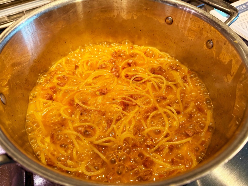 A couple of things to watch: stir early and stir often once the pasta goes in — spaghetti has a talent for clumping and sticking in the first few minutes before it softens and separates. And pull it while it still has a touch of bite; the noodles will continue to absorb sauce as they sit on the platter.