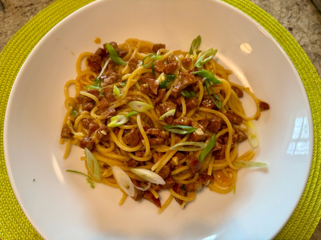 Adding half of the scallions off the heat and reserving half for garnish is a simple but smart move — you get both the mellow, wilted depth of cooked scallion woven through the pasta and the fresh, sharp bite of raw scallion on top.