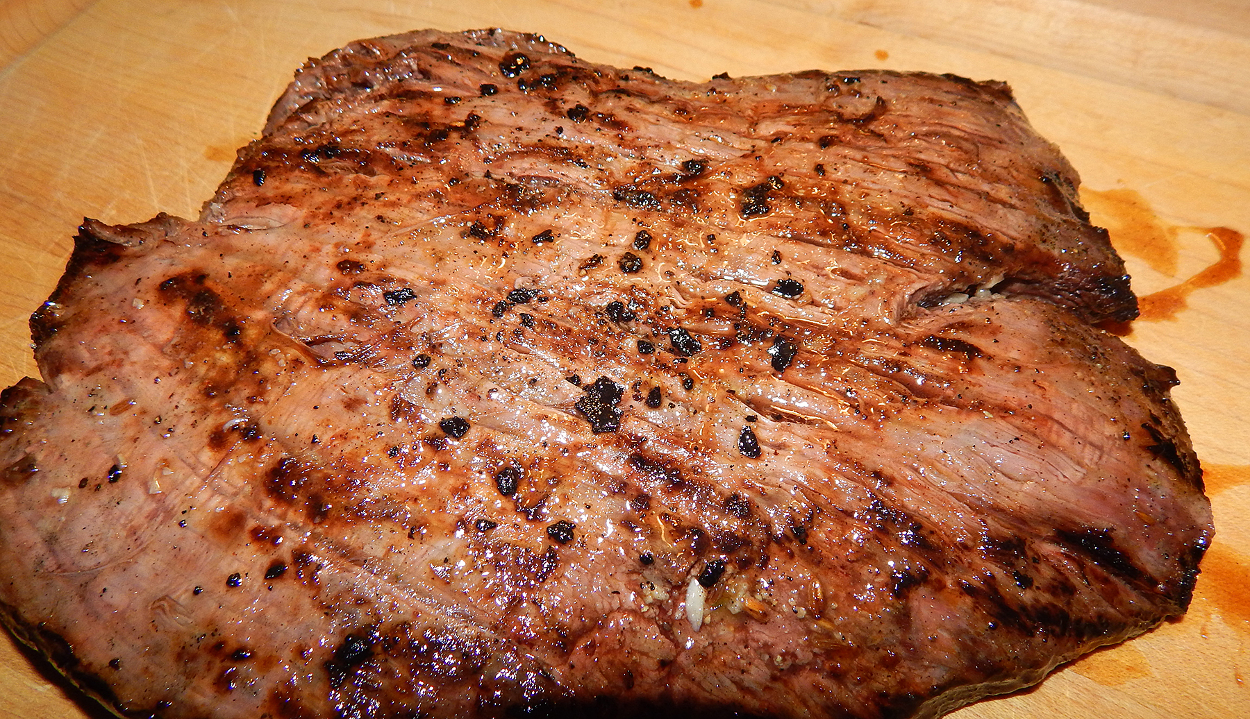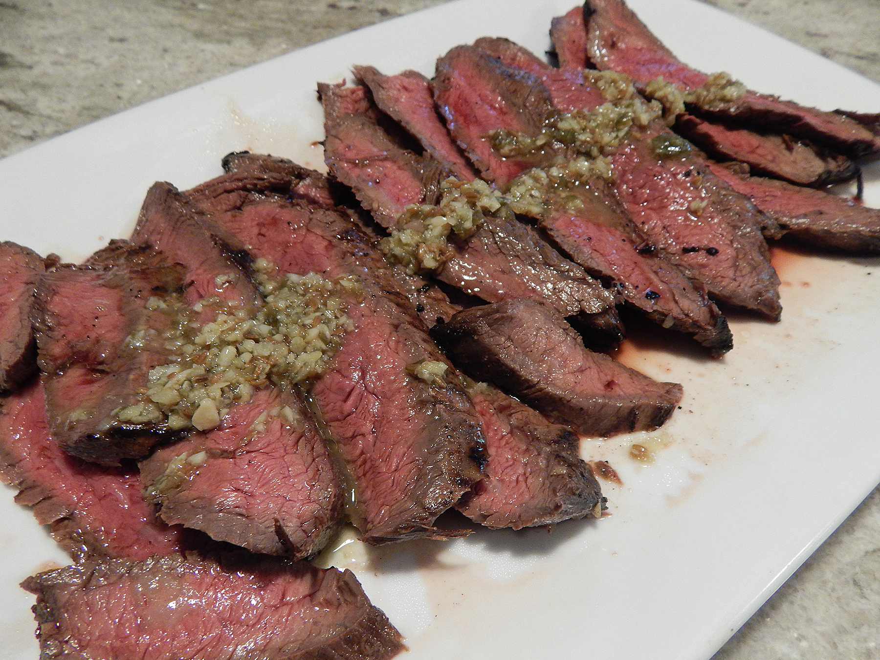 Found in our online Fine Cooking site, this flank steak recipe, ‘Mo J’ Marinated & Grilled Flank Steak, by Norman Van Aken, immediately caught our attention mainly due to the “Mojo” sauce which contains some of our favorite ingredients. And at the suggestion of the author, we also grilled bermuda onions and made a salad of sliced tomatoes, seedless cucumbers and a smattering of snipped fresh chives drizzled with a homemade vinaigrette. While we made it just for the two of us, it is sure to be a crowd pleaser if cooking for more.