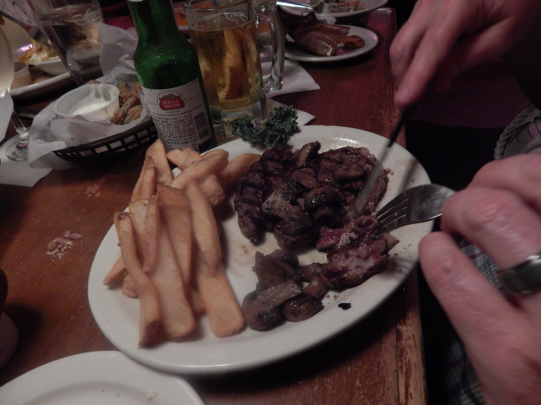 Now about those entrees… Russ ordered the 16 oz. Ft. Worth Rib Eye, which when first served was too well-done for the requested medium-rare, so it was sent back. Lynn chose the Dallas Filet smothered with mushrooms, the baked sweet potato without the cinnamon butter and a side of green beans. Well I won the prize for best steak which was a delicious, perfectly-cooked lean filet that melted in my mouth. However, my sweet potato had probably been cooked hours ago and they added a big glob of the cinnamon butter which I specifically told our lightning-mouthed waitress I didn’t want, and the side of beans was all but inedible.