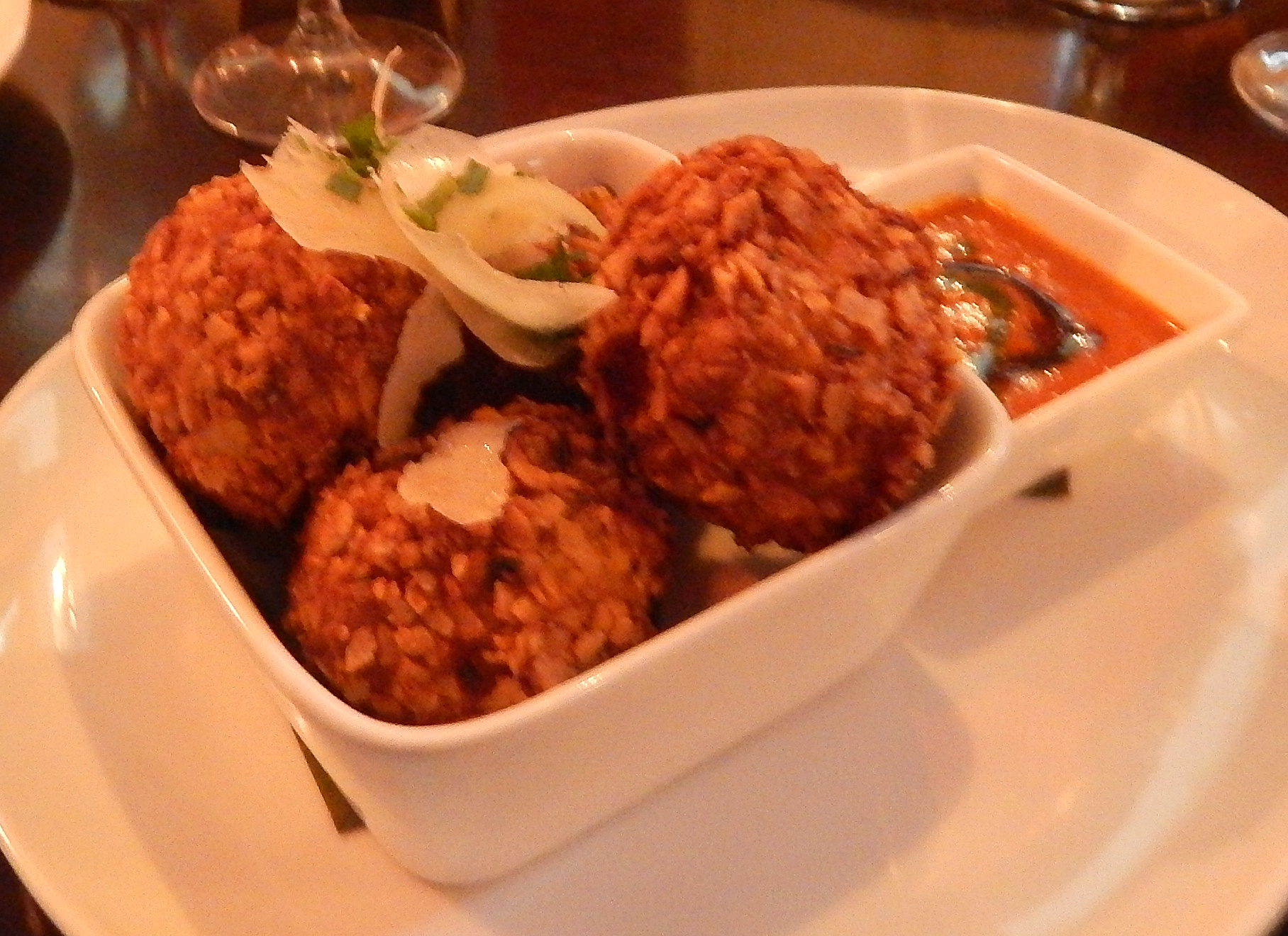Barry and Eve chose the Arancini, a twist on the classic Italian rice ball—almond crusted green apple risotto fritters with gazpacho dipping sauce and dry aged goat cheese; the four pieces easily divided among the two couples.
