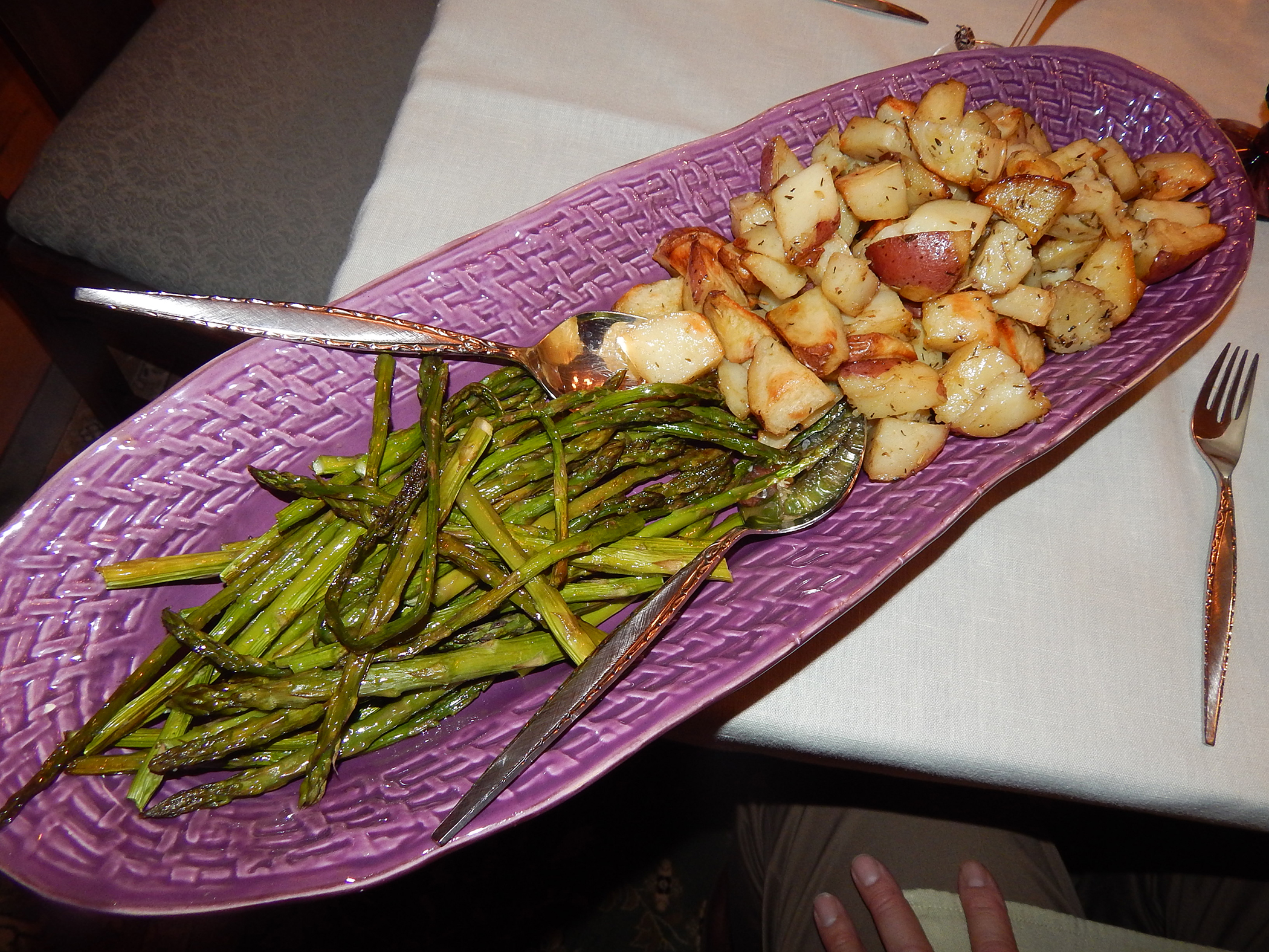 As dinner was ready to serve, we gathered around Rosanne’s artistically arranged seasonal tablescape, and Gary served us with her first course, a wonderful Hearty Tomato Soup with Lemon and Rosemary taken from Foodnetwork.com—a nice reprieve from the usual side salad. It was one of the best tomato soups I’ve ever had, so of course I had to get the recipe! Then the big guns came out… Two platters of Rosanne’s Succulent Marinated Chicken Breasts with roasted red peppers, asparagus and provolone; accompanied by an elongated, purple ceramic dish containing roasted potatoes and grilled asparagus. No complaints from anyone on this meal!