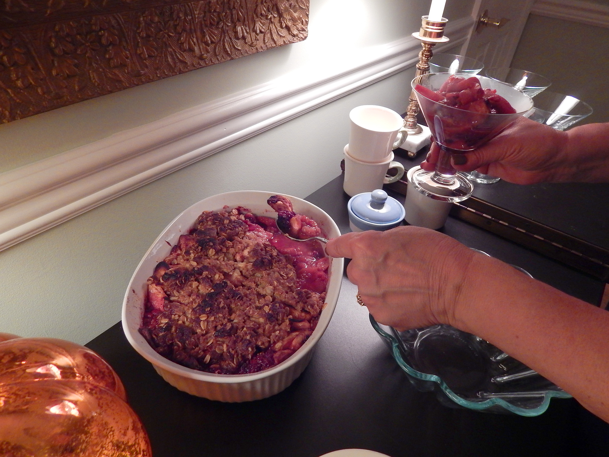 Dessert, was an elegant finishing touch—Old-Fashioned Apple Crisp, based on a recipe by Ina Garten, The Barfeoot Contessa. Conversation and laughter flowed easily while the evening wound down over coffee and dessert. Alas, all good things must come to an end—at least temporarily.