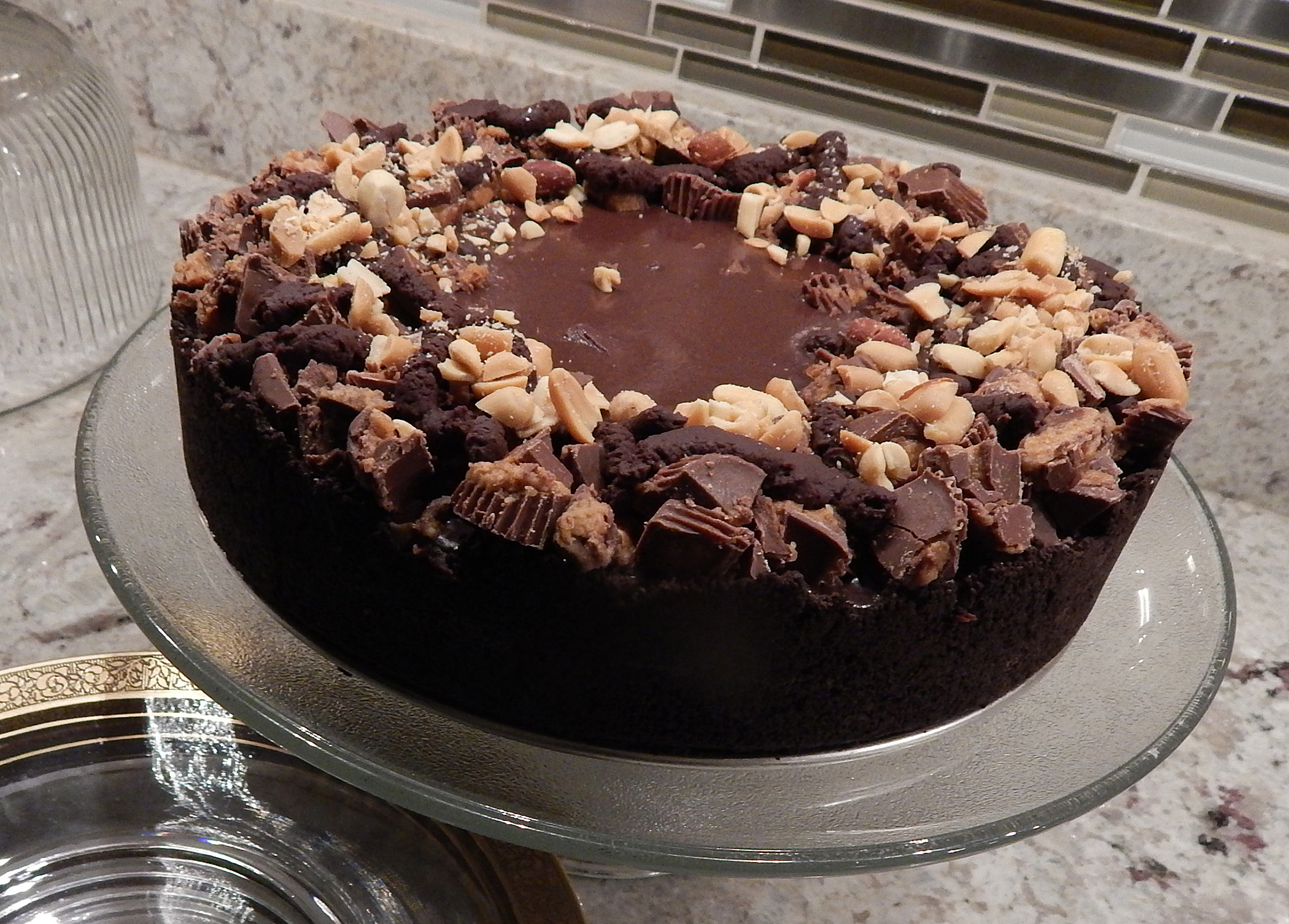 Friends think it’s strange that even though I don’t eat dessert, I still love to bake. I guess the process helps fulfill my inner need to create something visual. So in that vane, not content with Vitaly’s topping, I took it to another level and rimmed the edge with 12. oz of coarsely chopped mini Reese’s Peanut Butter Cups and a drizzle of melted semisweet (or white) chocolate.