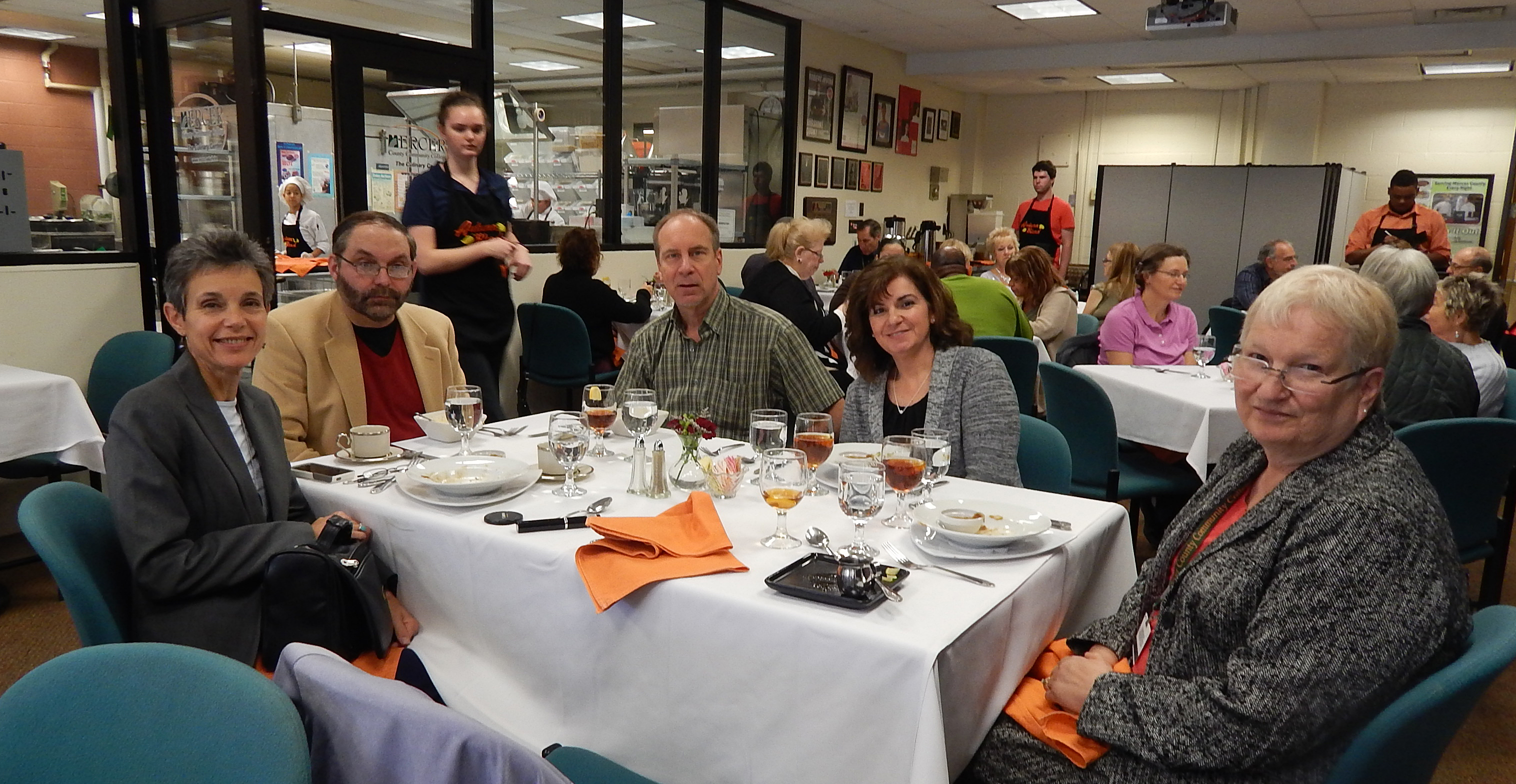 —A nice perk here at the college, our Hotel, Restaurant and Institution Management (HRIM) program offers several dining experiences for faculty, staff and the community each Fall and Spring semester. One of the offerings this Fall was the aptly named “Autumn Blend.” For only $10, each Wednesday, this lunch class—which had also designed the menu selections—prepared and served the meals. Having attended many of these in the past, six of us from the College Advancement department wasted no time in procuring tickets for another delicious meal.