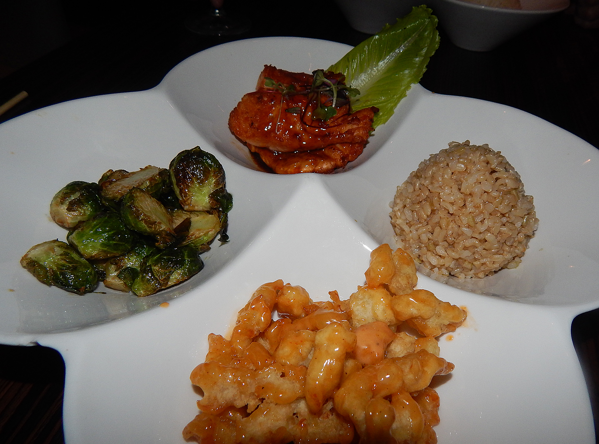 Lynn’s box consisted of brown rice, Wok-fried Brussels Sprouts, Salmon Teriyaki and Dynamite Chicken. Those incredible sprouts “wowed” us! Now I am on a mission to get the recipe. The salmon was also very gratifying, but the Dynamite Chicken was a bit too sweet and therefore not my favorite (with plenty of everything left over for take-home.)