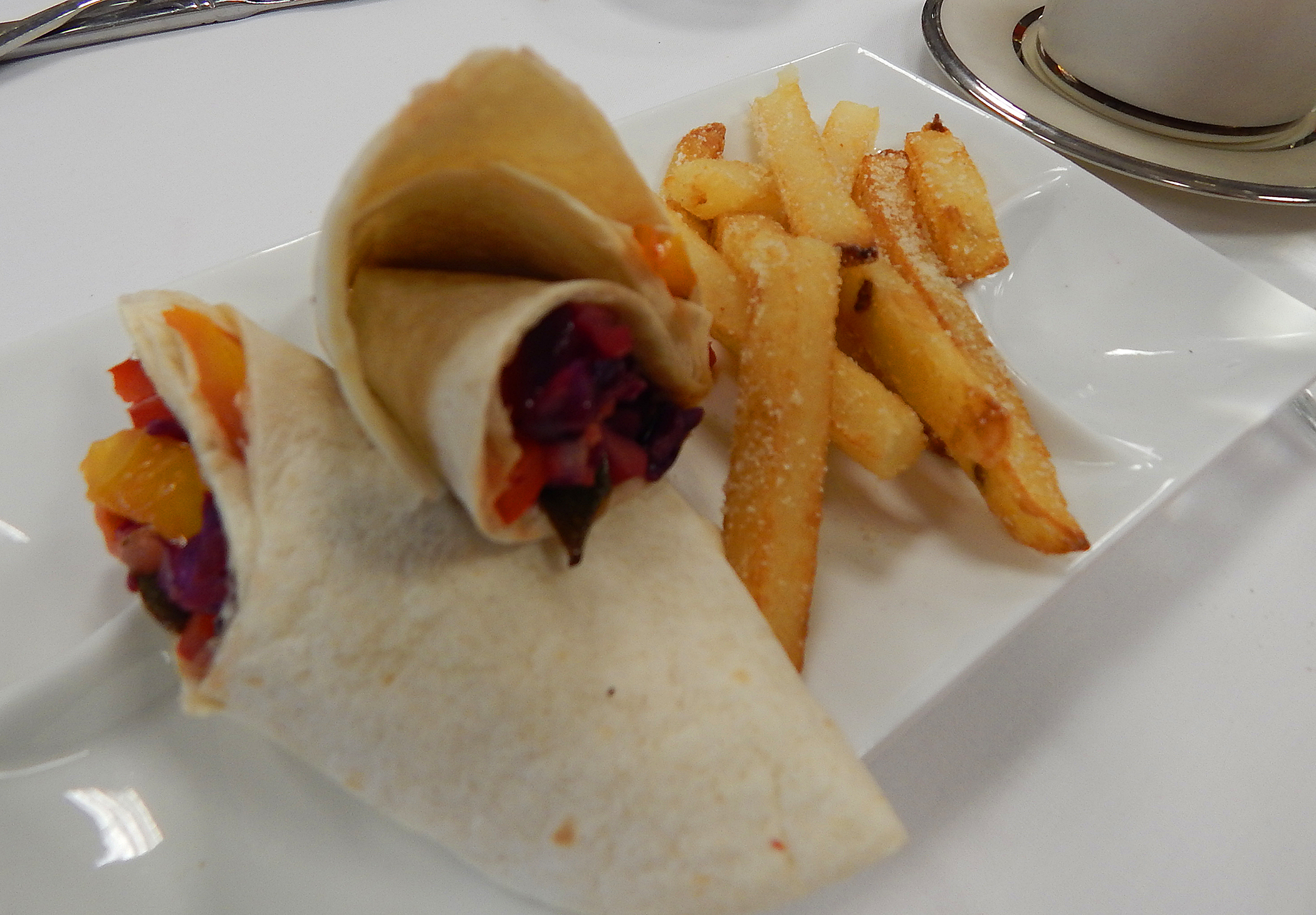 Next up, the entrees. Of five choices, two people ordered the Turkey Sheperd’s Pie topped with a mash of Yukon Gold potatoes. Another three (myself included) opted for the Lobster Risotto, with pieces of lobster atop Arborio rice and brown butter served with grilled asparagus. While nicely plated and tasty, it didn’t pack as much of a flavor punch as my Tuna Tartare. Another guest chose the Grilled Vegetable Wrap with grilled yellow and red bell peppers, diced tomatoes, sliced cabbage and minced ginger wrapped in a flour tortilla served with truffle fries. In name, truffle fries sound decadent and delicious, but this order came with limp fries and underwhelmed the dining patron.
