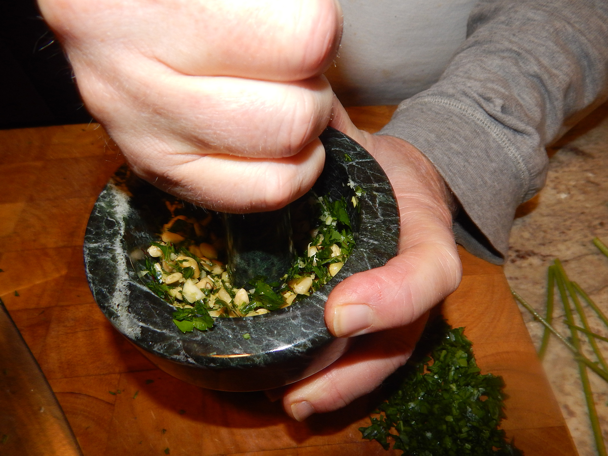 Another blunder? At this point Mary was doing most of the reading out loud and I was following (or more precisely, jumping ahead), when it came time to make the filling. First off, we couldn’t locate brandy or cognac, even though Russ and I “knew” we had some. Fact is, we used up the brandy for a pork dish several weeks prior and never replaced it. When in doubt, Google! Three different websites noted you could substitute scotch or bourbon. Being that we only needed 1 tablespoon, I wasn’t about to run out in the rainy weather to a jam-packed shopping center for that small amount. So what did we do? Place another call to Russ at work to get his opinion, which was in agreement with me–use the bourbon.