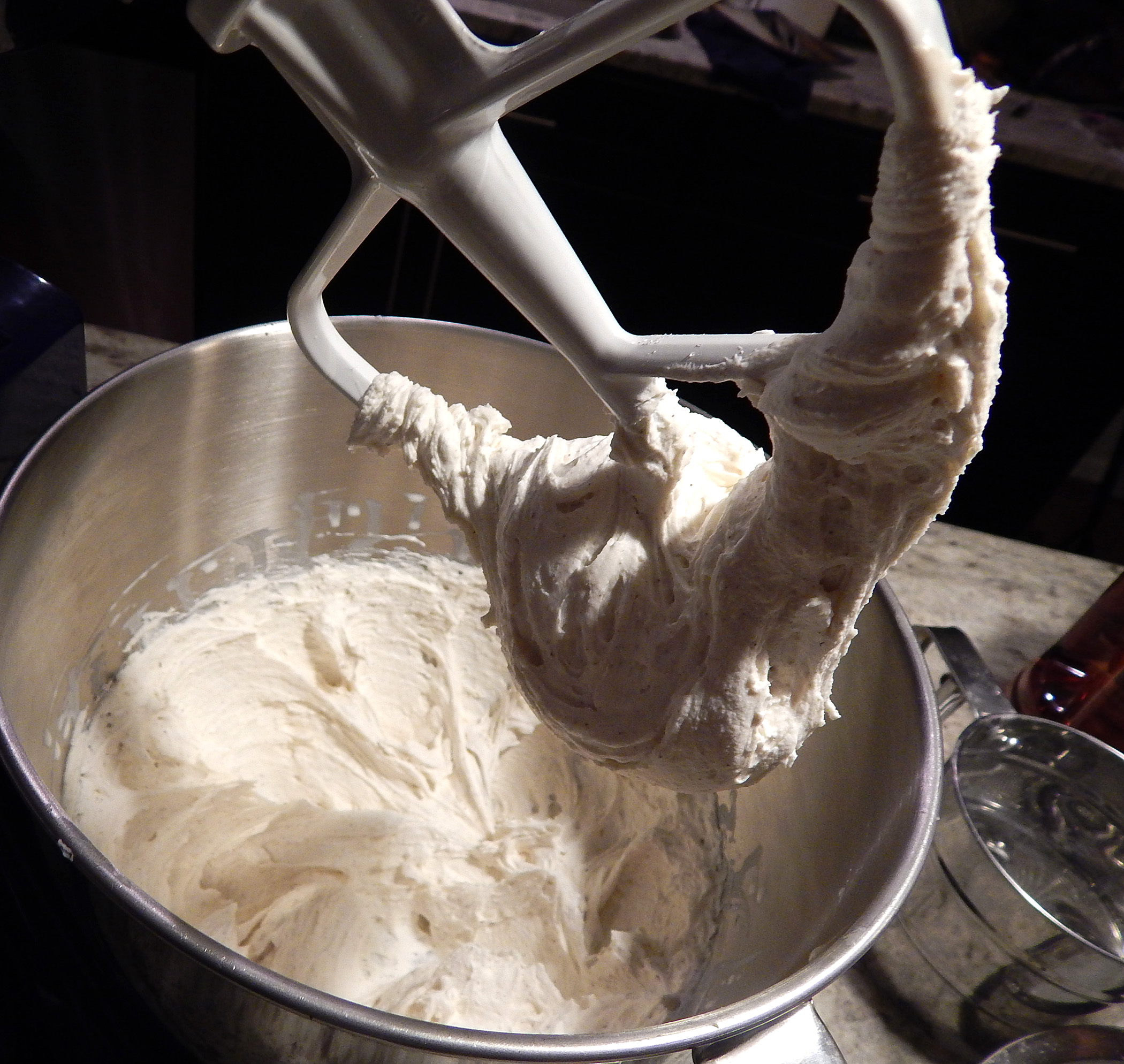 Back to the filling. Just as I got done pouring the 1/2 cup heavy cream into the mixer with the mascarpone cheese mixture, Mary read aloud “Beat the heavy cream in another bowl with beaters…” Wait, what?? Realizing that wasn’t going to happen, and not having another 8 ounces of mascarpone, we decided to forge ahead and see if the mixture would all come together in ONE bowl, and luckily for us, it did!