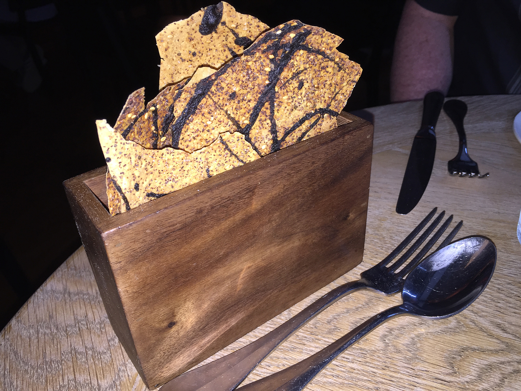 After selecting a bottle of Spanish red wine from a very extensive wine list, our friendly waitress brought us a wooden box of paper thin bread crisps, seasoned with black garlic and spices, to nosh as we pondered the menu—full of small plates with huge flavors—right up my alley! She explained that patrons usually order with family-style in mind, sharing the plates as they are delivered in non-rushed fashion. So as twilight settled around us, we enjoyed a leisurely 2 1/2 hour dinner.