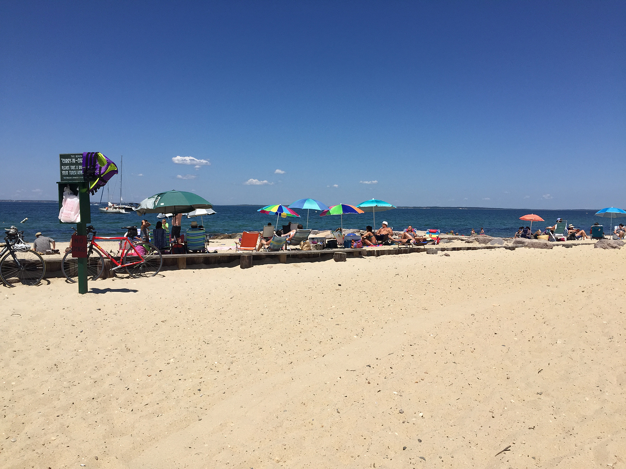 The South Beach where we spent a few hours the past couple of days was so windy on Thursday that Russ was shivering under his umbrella—and to think temps were near 100 back home! Rita informed us that the prevailing winds are usually from the Southwest which would account for the strong winds at this location. Based on that fact, we decided to try the John Sylvia State Beach, approximately two miles long, between the towns of Edgartown and Oak Bluffs along the Nantucket Sound shoreline and Sengekontacket Pond. It’s a very popular beach for families because there is a gradual slope into deeper water and the waves are usually small (which they were on Friday, but not so much on Saturday.) On a hot summer day, parking places along the paved parking lane adjacent to the road are mostly full by 10 am, but we managed to score a spot both days around the noontime hour.
