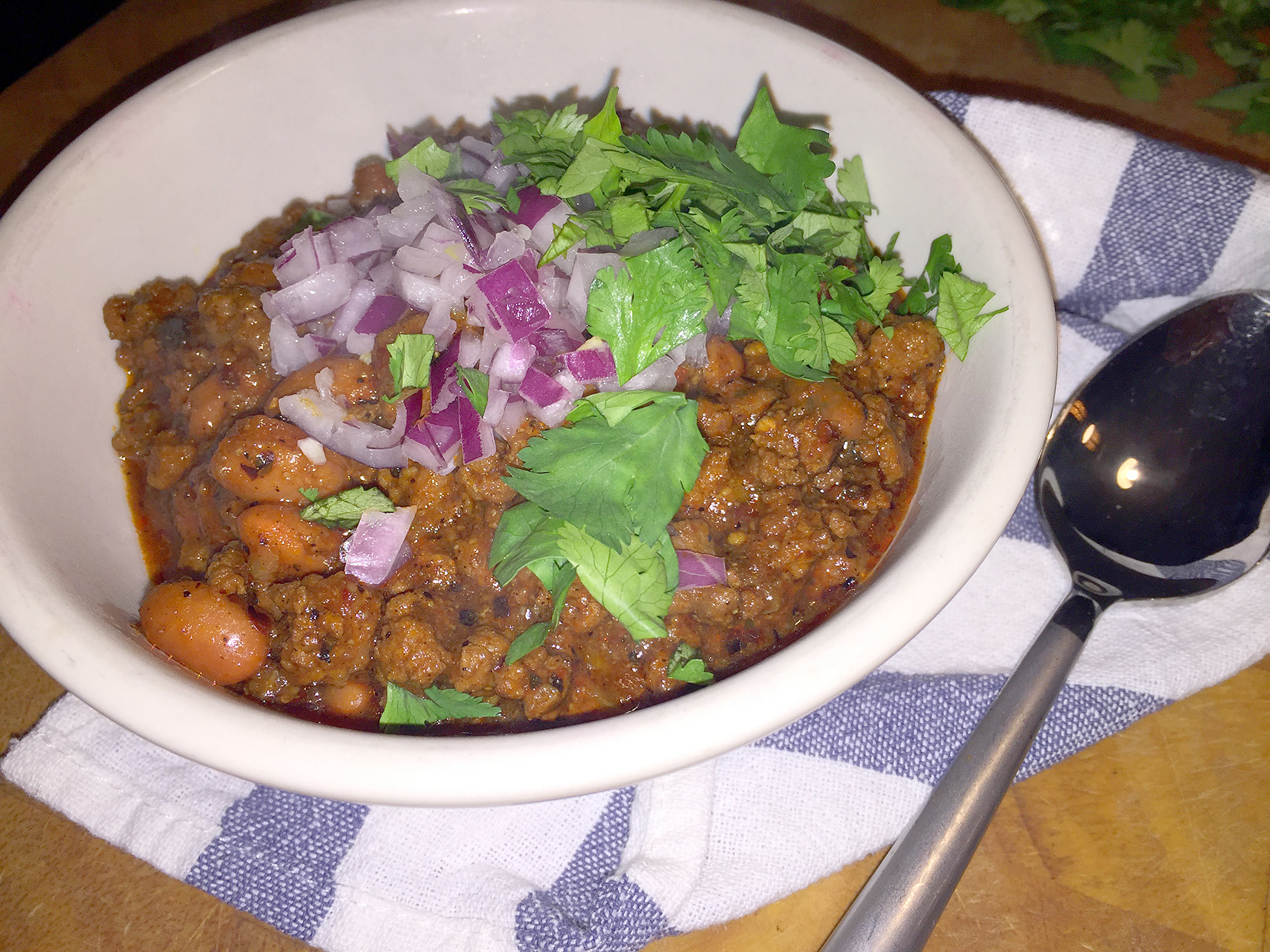 This goes against my grain, but we decided to follow the recipe, and the results were a deeply fragrant and intensely flavored chili. Personally I like more beans and some veggies such as red, yellow and/or green bell peppers and sliced mushrooms. So perhaps next time’ I’ll add those ingredients to this basic recipe—or not, because this was indeed a very good chili! I’ll just get my veggie quota from a side salad…