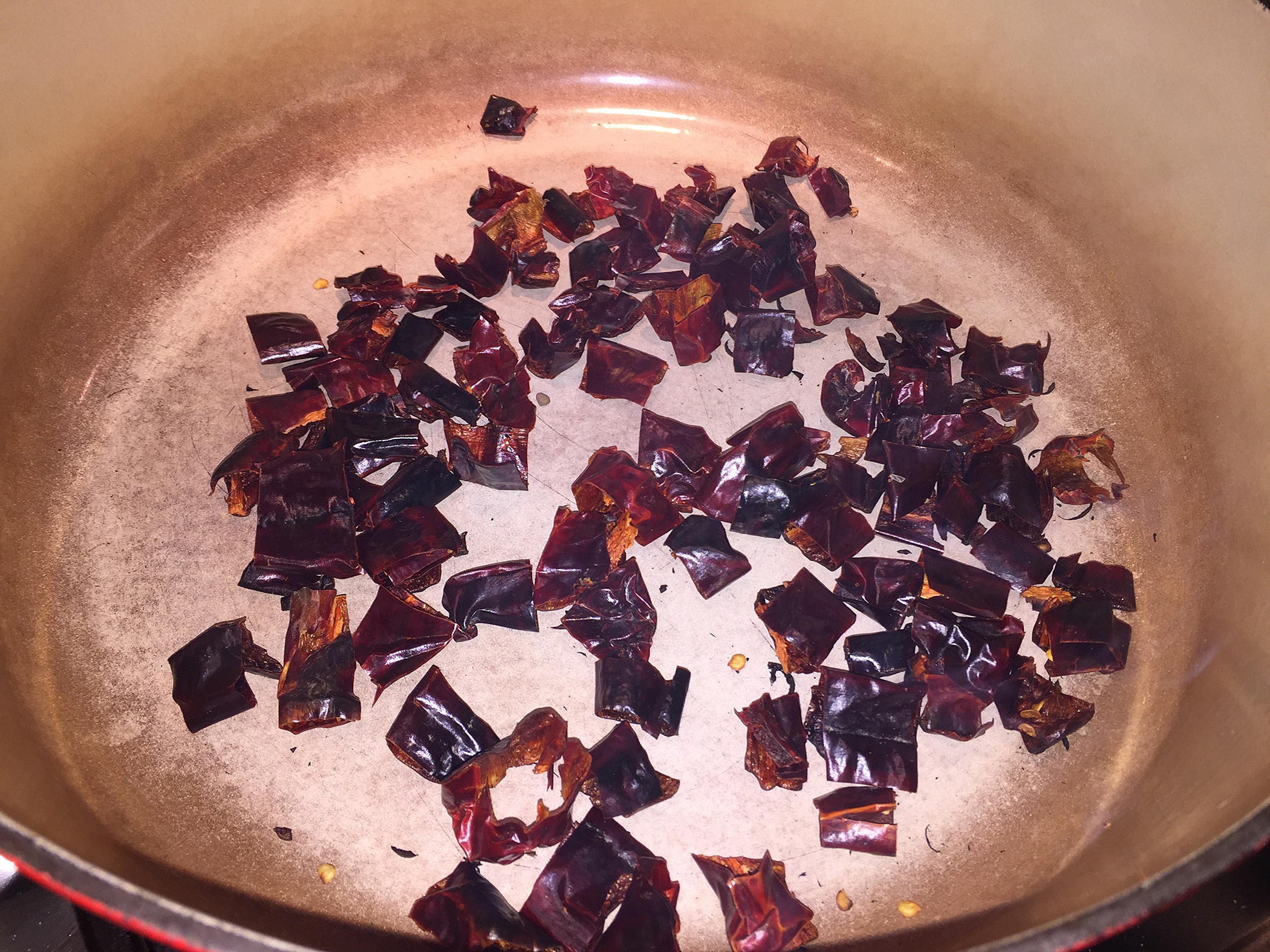 - Meanwhile, place anchos in Dutch oven set over medium-high heat; toast, stirring frequently, until fragrant, 4 to 6 minutes, reducing heat if anchos begin to smoke. Transfer to food processor and let cool.