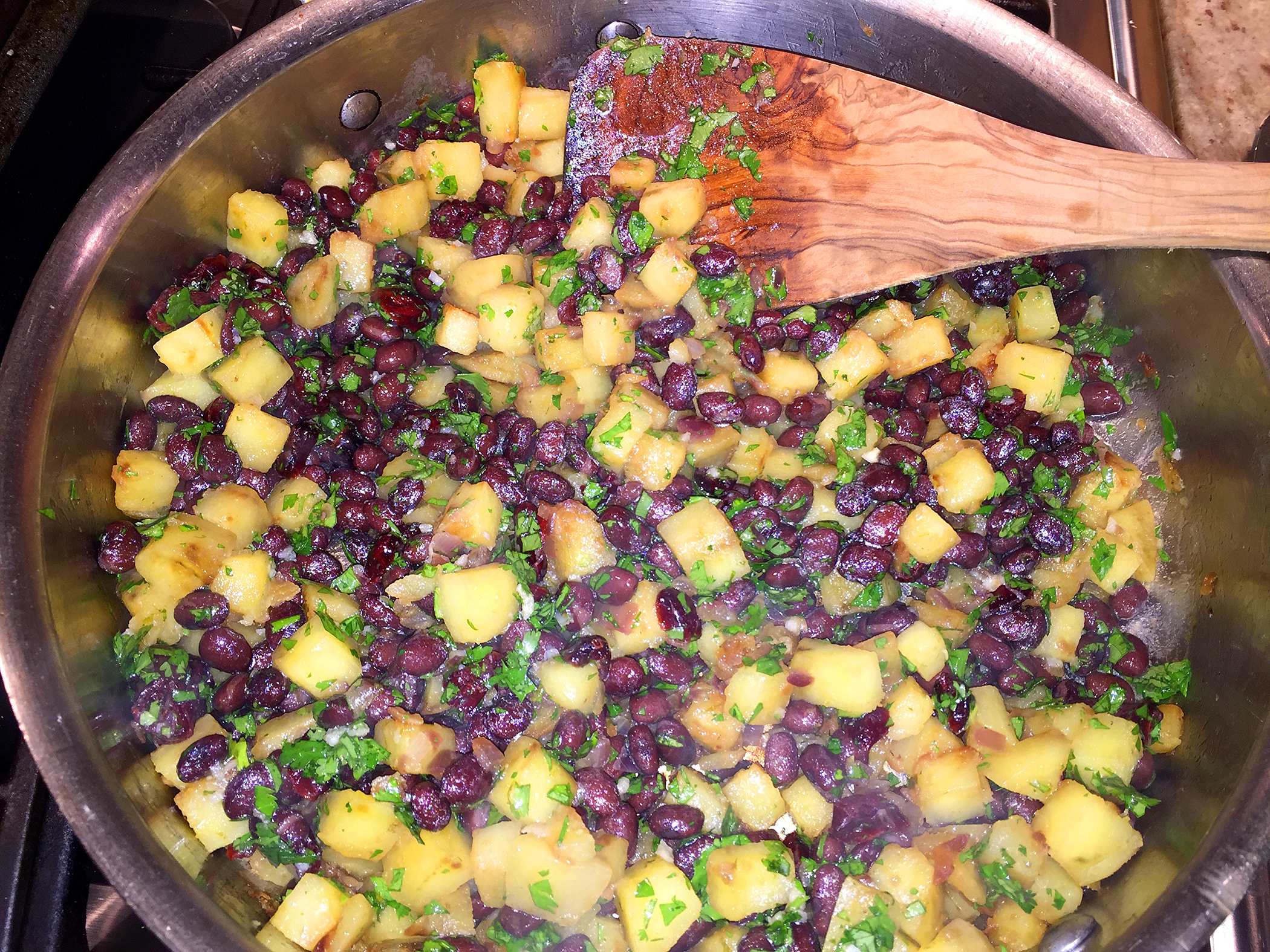- In a medium bowl, combine the garlic, lime zest, juice, and 2 Tbs. of the canola oil. Add the potatoes and onions, black beans, cranberries, and cilantro and toss gently to combine. Season to taste with salt and pepper and serve with the chicken.
