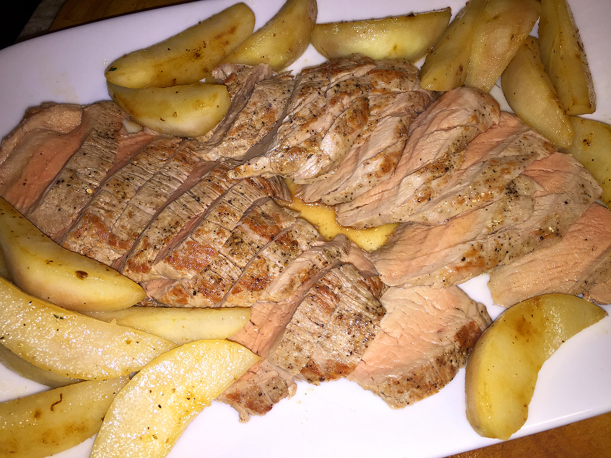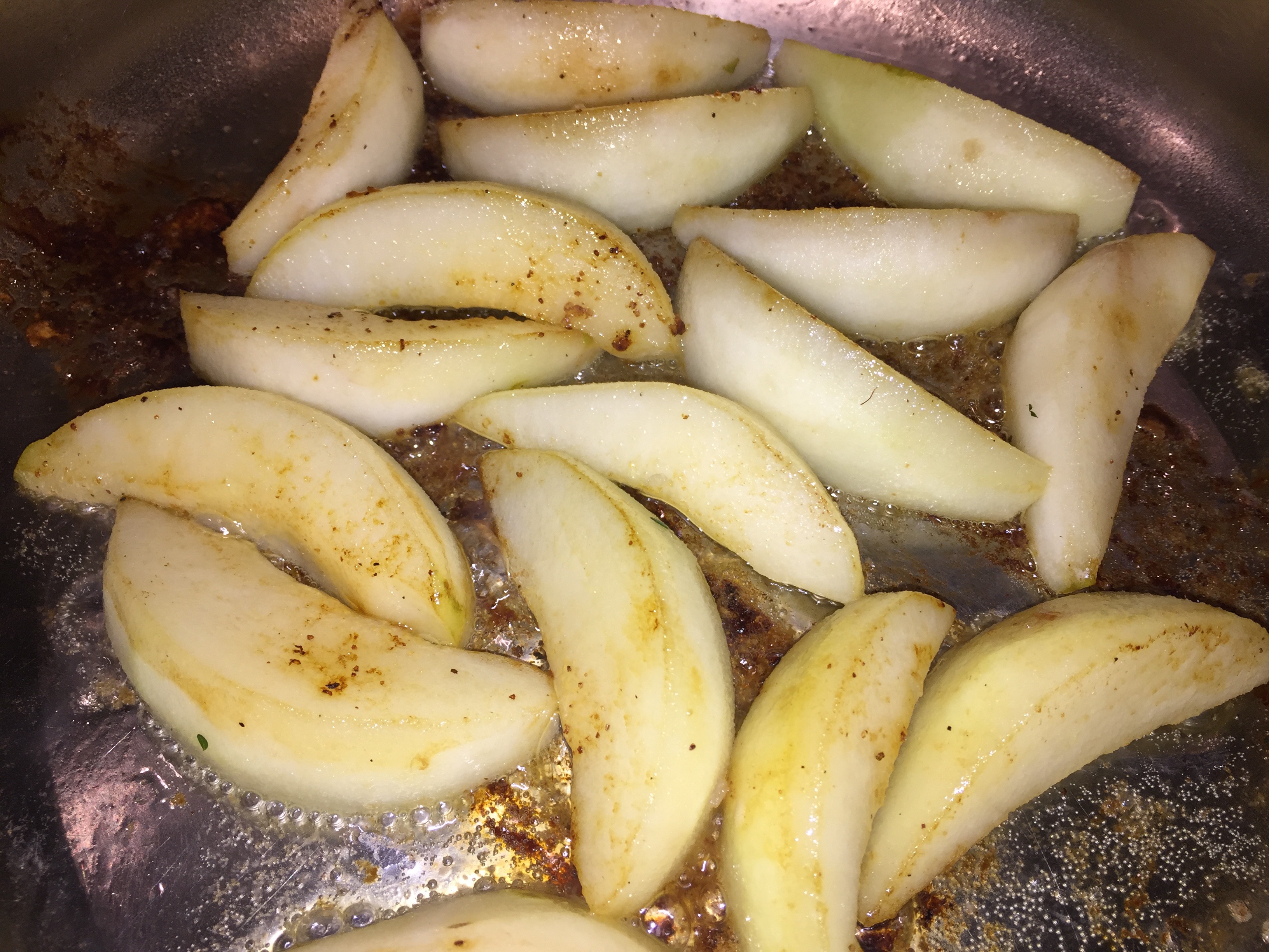 While the pork is “resting,” cook the pear slices until lightly browned.