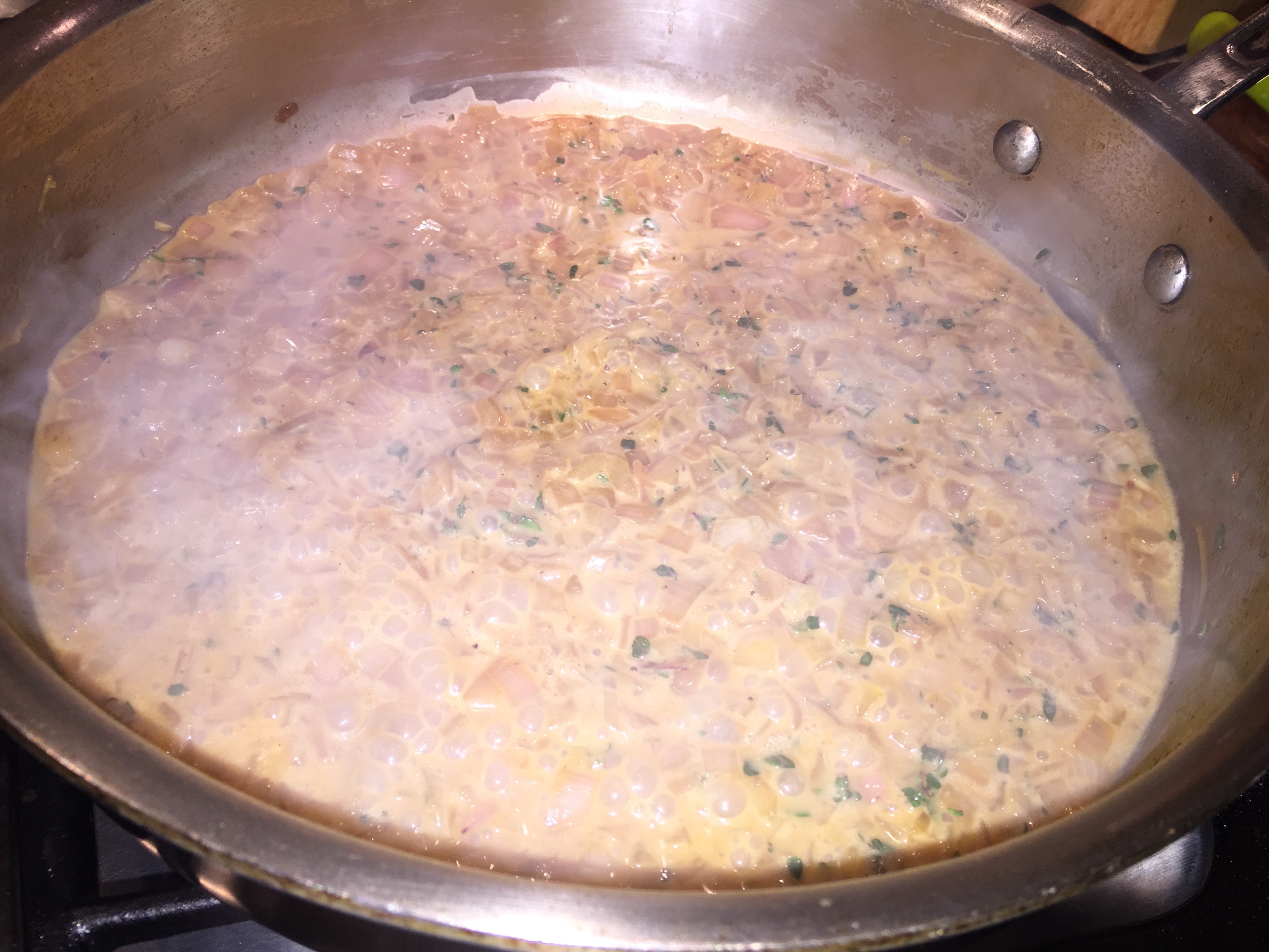 - Add the remaining 1 Tbs. butter and the shallots to the skillet and cook, stirring, over medium heat until the shallots are just beginning to turn golden, 2 to 3 minutes. Add the vinegar and stir, scraping up any brown bits. Add the cider and cook until slightly reduced, 2 to 3 minutes. Whisk in the heavy cream, mustard, and thyme and cook until slightly thickened, about 3 minutes. Season to taste with salt and pepper.