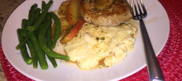 Like a well-conducted symphony, the pork and apple juices mingle beautifully and make a lovely sauce for the chops and cheesy polenta. For a pop of color to the dinner plate, I added some steamed green string beans coated with a light splash of Galega EVOO and a Sicilian Lemon White Balsamic Vinegar, also both purchased in Culpeper.