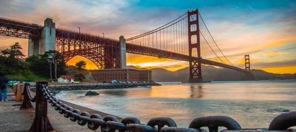 A panoramic view of the beach on the bay; you can see San Francisco in the distance to the left of the trees on the right.