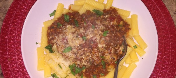 To finish, we added some grated parm, a bit of chopped fresh basil, and of course in my case, another sprinkle of red pepper flakes. Any type of pasta will work. We chose gluten-free rigatoni with ridges to help capture the sauce into all of the nooks and crannies. Result? Very satisfying and just as filling as a meat sauce. Now officially in our bank of “will make again” recipes is Meatless “Meat” Sauce.