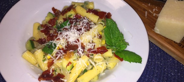 Mid- to late-summer reigns supreme for fresh corn here in the Delaware Valley, so I was not about to use frozen. Plan on three to four ears, depending on the size of the cobs, to wield three or more cups worth. After husking, simply use a chef’s knife to slice off the kernels. I found that doing so over a rimmed half baking sheet prevents your prep area from turning into a war zone.