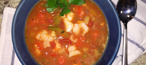 Russ preps the veggies. Then while those are simmering, he starts chopping the seafood.